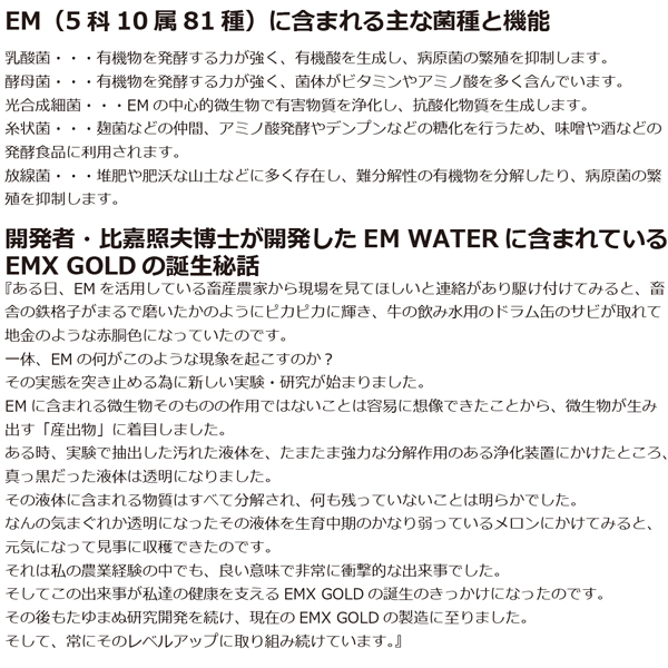 精製水にEMX GOLDを2%(10ml)配合した安全な健康飲料水です。