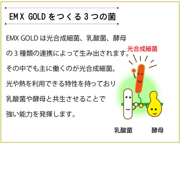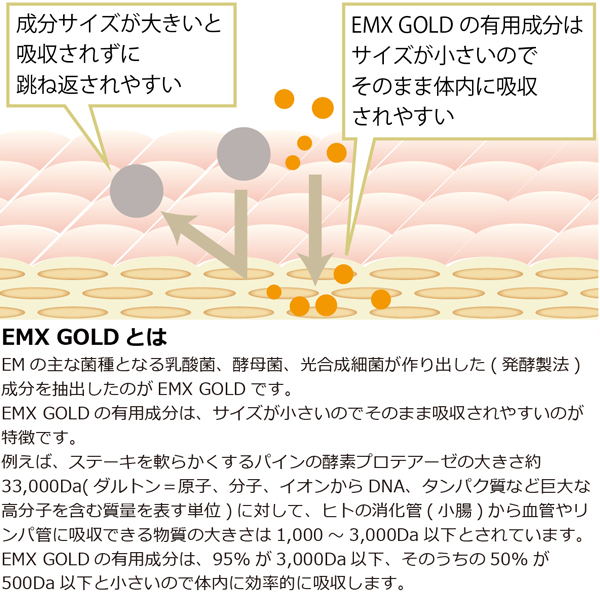 EMX GOLDは菌が作り出した生成物質が健康効果を発揮するという考え方を取り入れた健康サポート飲料です。