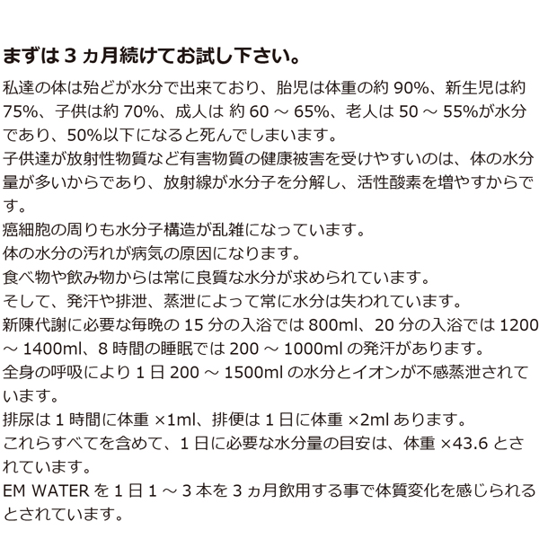 EM WATERを毎日1~3本の飲用を続ける事で、良質な水分と健康への効果がもてる効率のよい健康飲料水です。