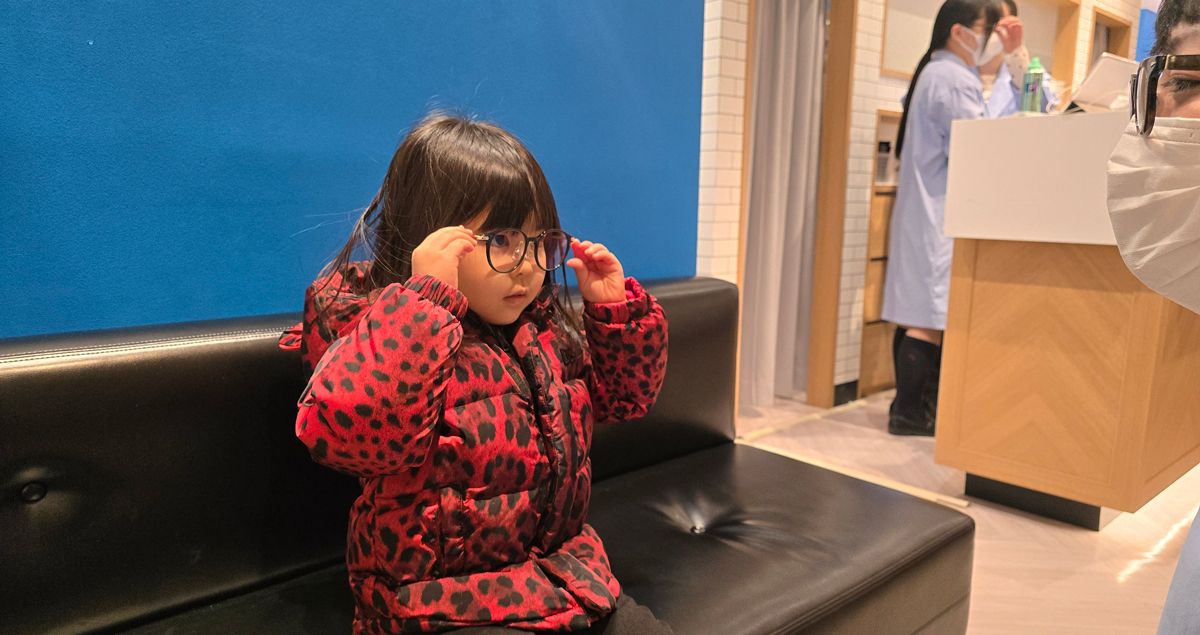 すぐにメガネ屋さんに駆け込むと、一人で店員さんに走り寄り、「すみませーん!この子供用のメガネが、ちょっとゆるくなっちゃったみたいで、こうやって下の方にいっちゃったり、曲がっちゃったりするから、直してください」とすべて上手に説明をしてくれました。