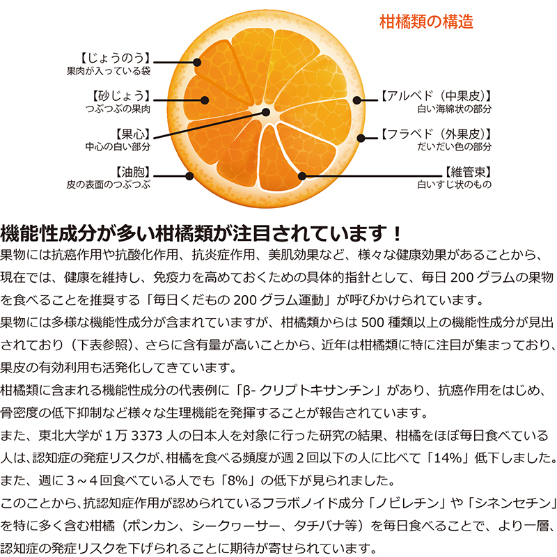 また、オレンジなどにはほとんど含まれていないβクリプトキサンチンが豊富で、糖尿病やガンなどに効果があると言われています。