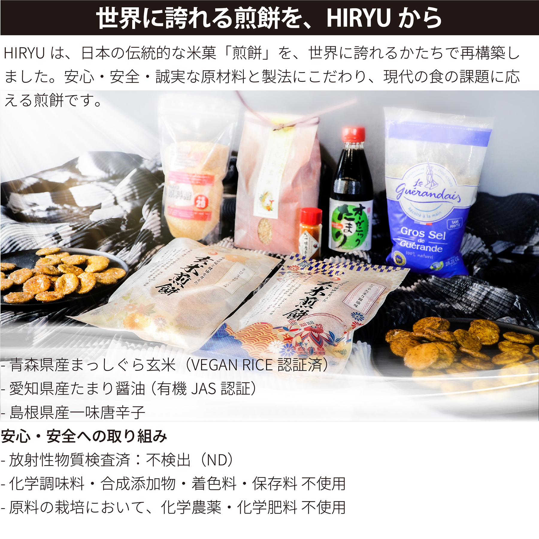HIRYUは、土壌・環境・命にやさしいお米を選び抜き、煎餅という日本文化の象徴に昇華させました。