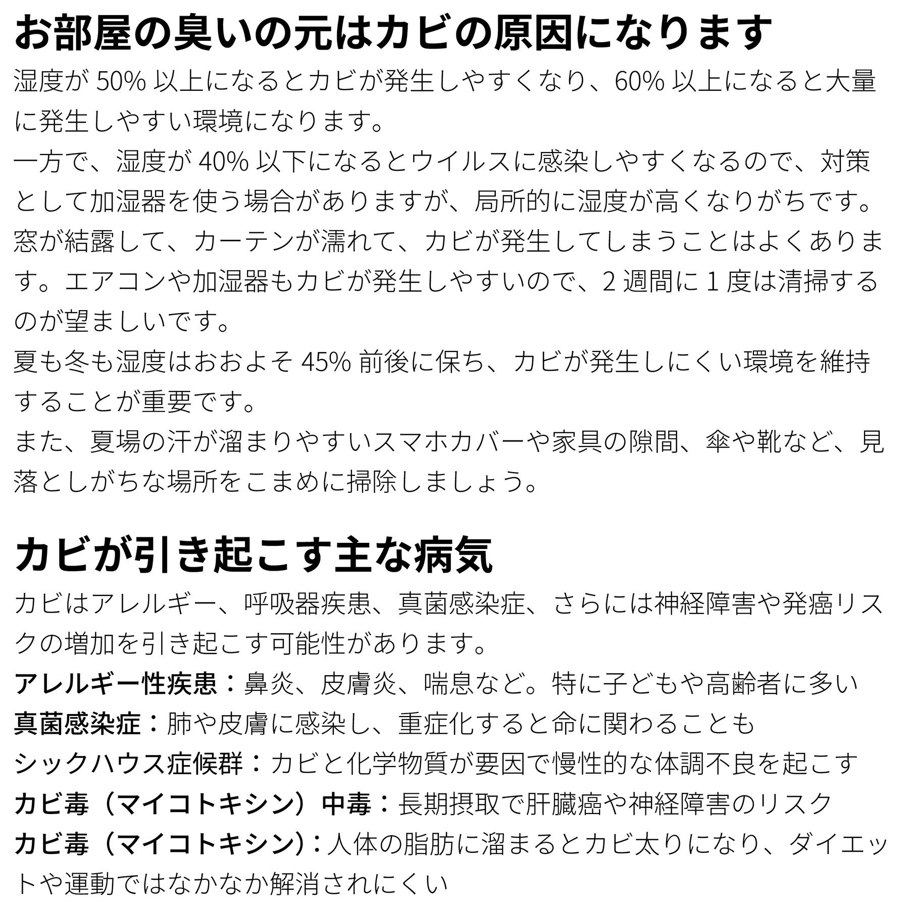 カビはアレルギー、呼吸器疾患、真菌感染症、さらには神経障害や発癌リスクの増加を引き起こす可能性があり、放置すると深刻な健康被害につながります。