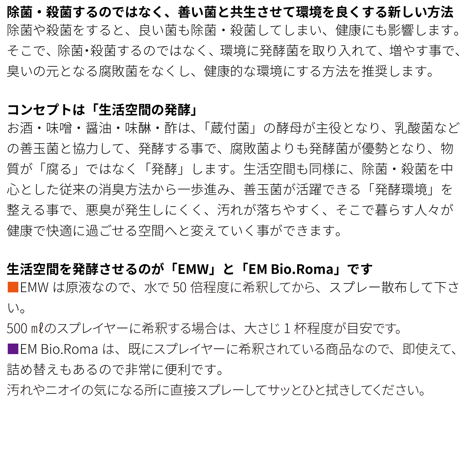 ナチュラルな掃除用品、無添加商品をお探しの方にオススメ。自然派素材の消臭剤EMW(イーエムダブリュ)を希釈したEM BioRomaは、化学物質を一切使用していない、天然素材100%のハウスケア発酵液です。