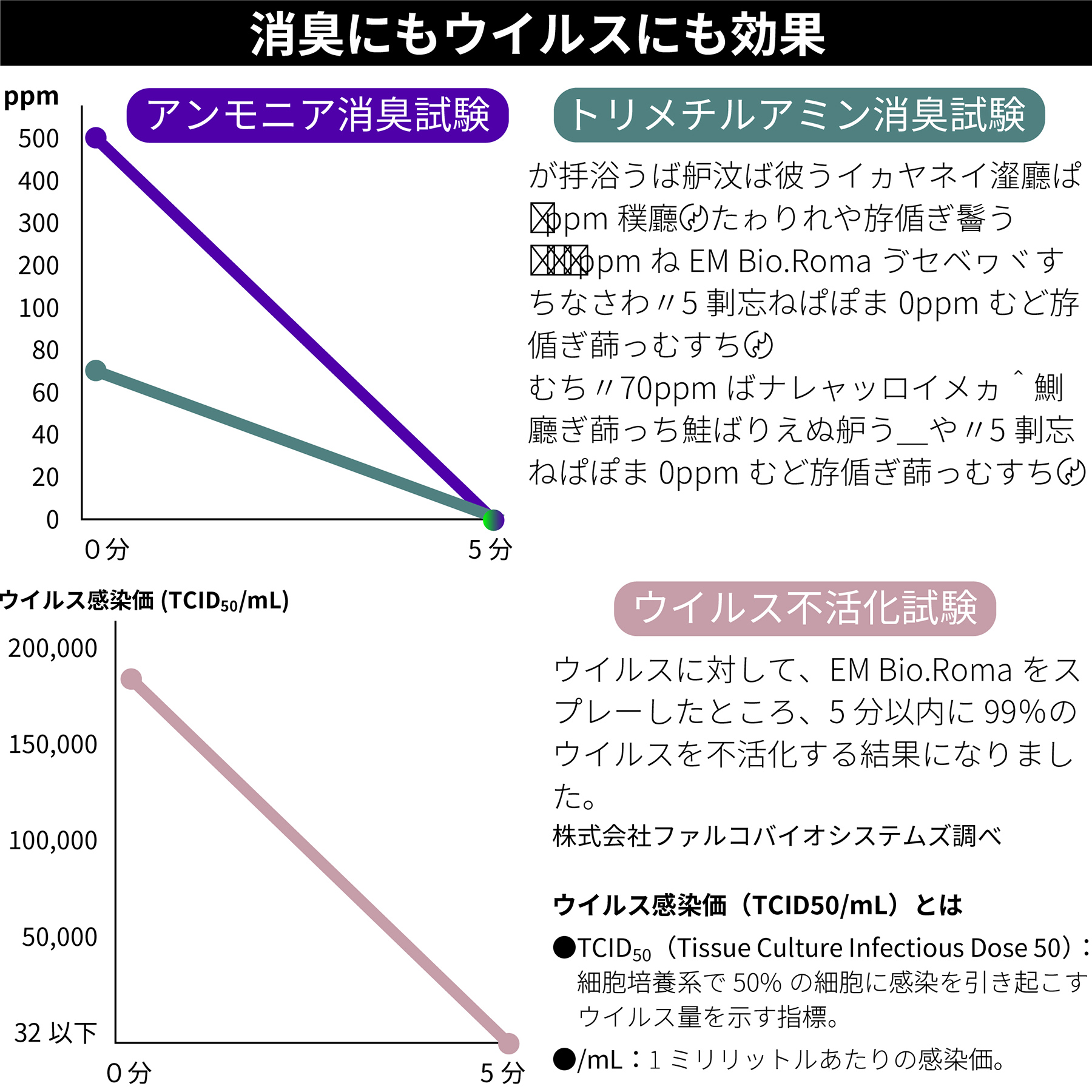 EMWも水で薄めて消臭剤として使用できますが、「薄めるのが面倒」「酸っぱいニオイが苦手」というお客様のお声から、消臭に特化して生まれたのがEM Bio.Romaです。