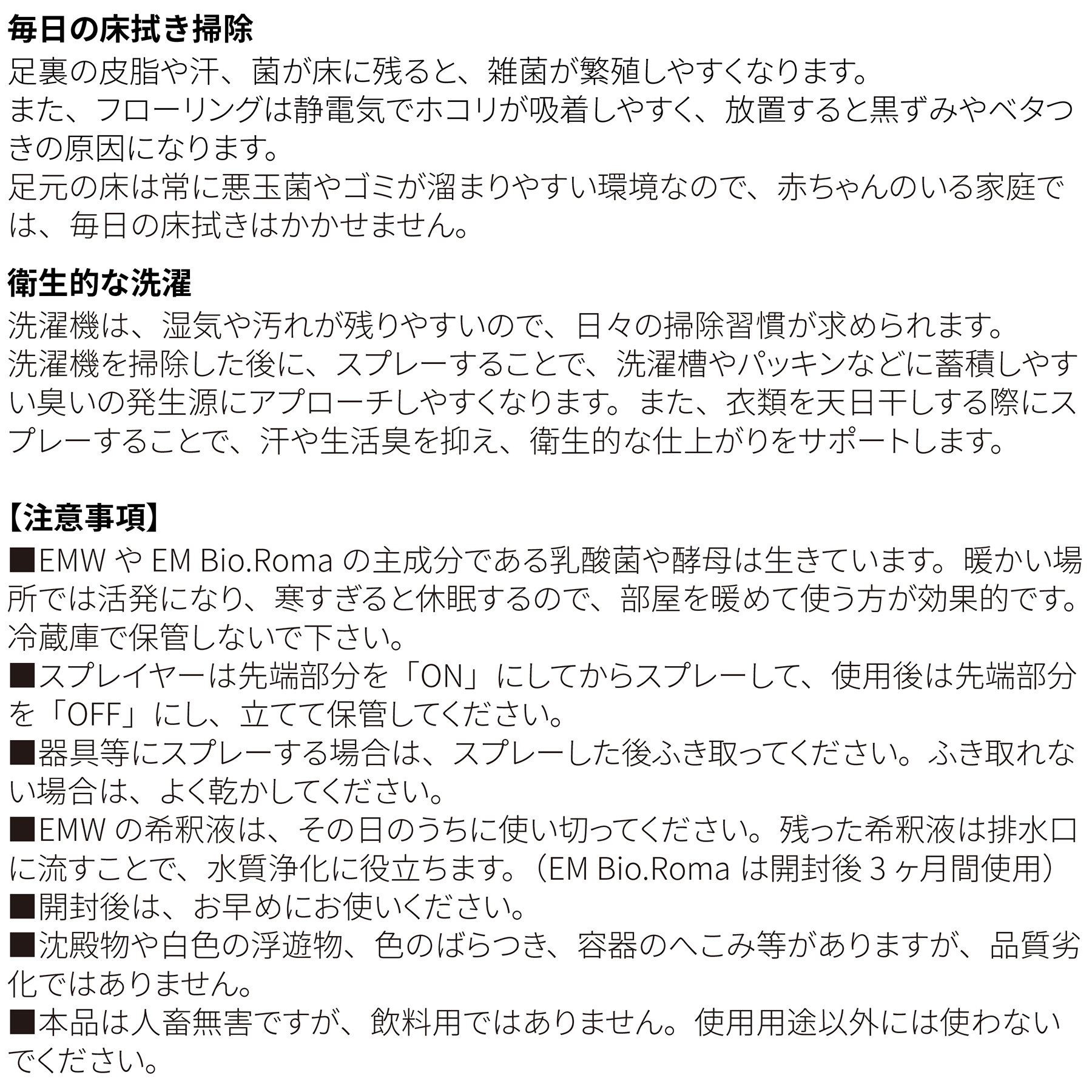 また、EMWは薄めると日持ちしませんが、EM Bio.Romaは3ヶ月間使用できます。