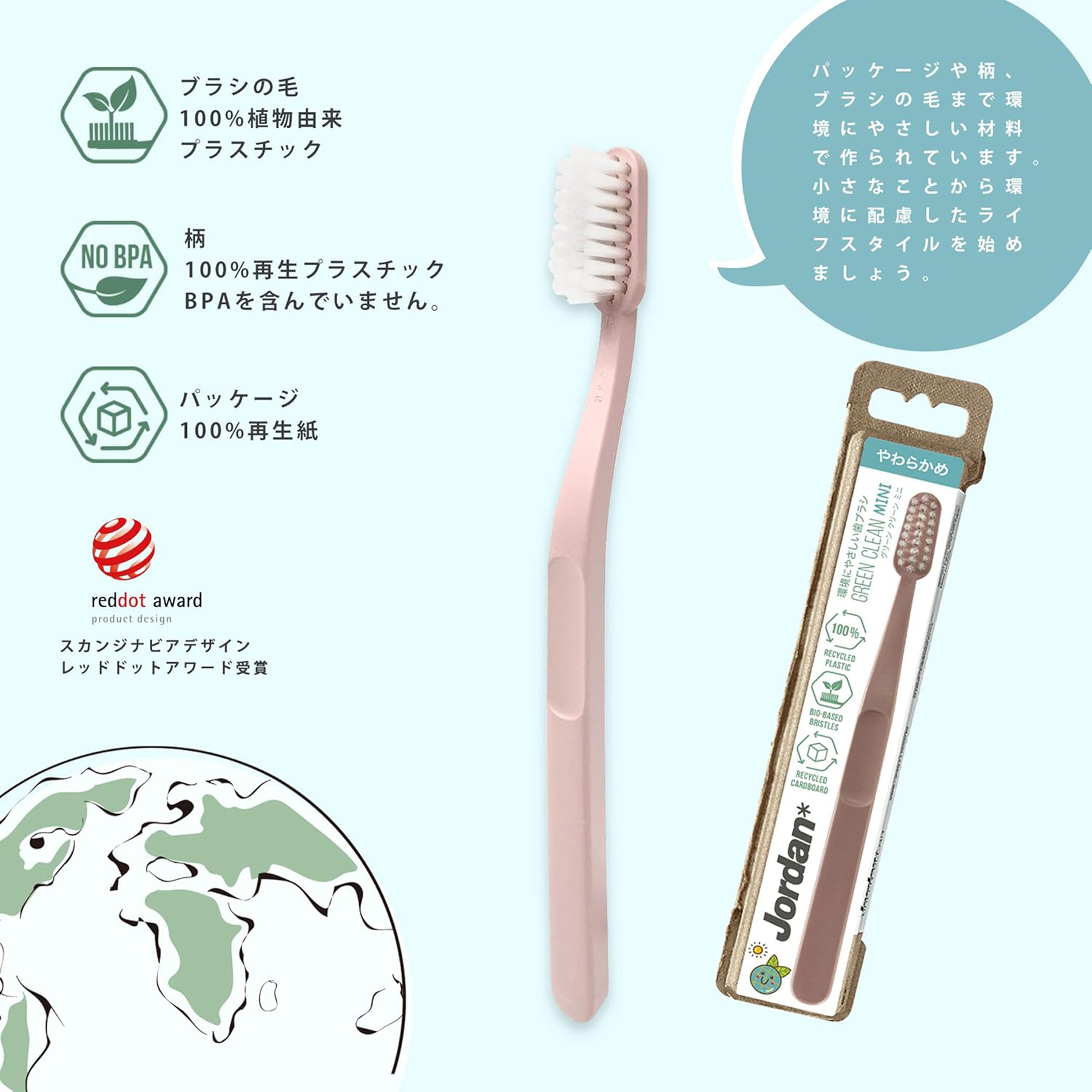 ハンドルは100%再生プラスチック、ブラシの毛は100%植物由来プラスチック、パッケージは100%再生紙ででできた、持続可能資源や再生資源をできる限り使用した、環境にやさしい歯ブラシです。