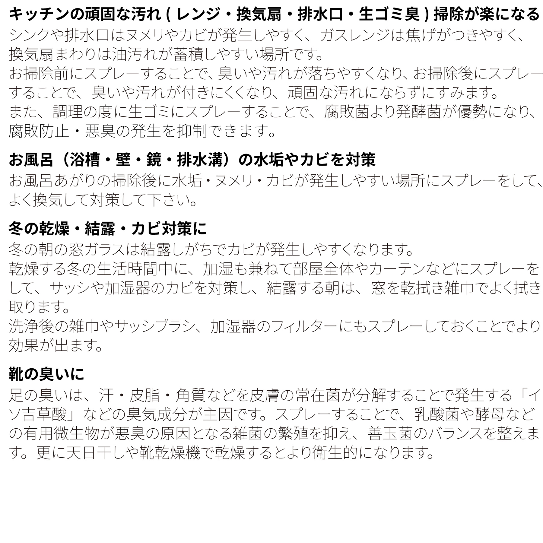 また、調理の度に生ゴミにスプレーすることで、腐敗菌より発酵菌が優勢になり、腐敗防止・悪臭の発生を抑制できます。