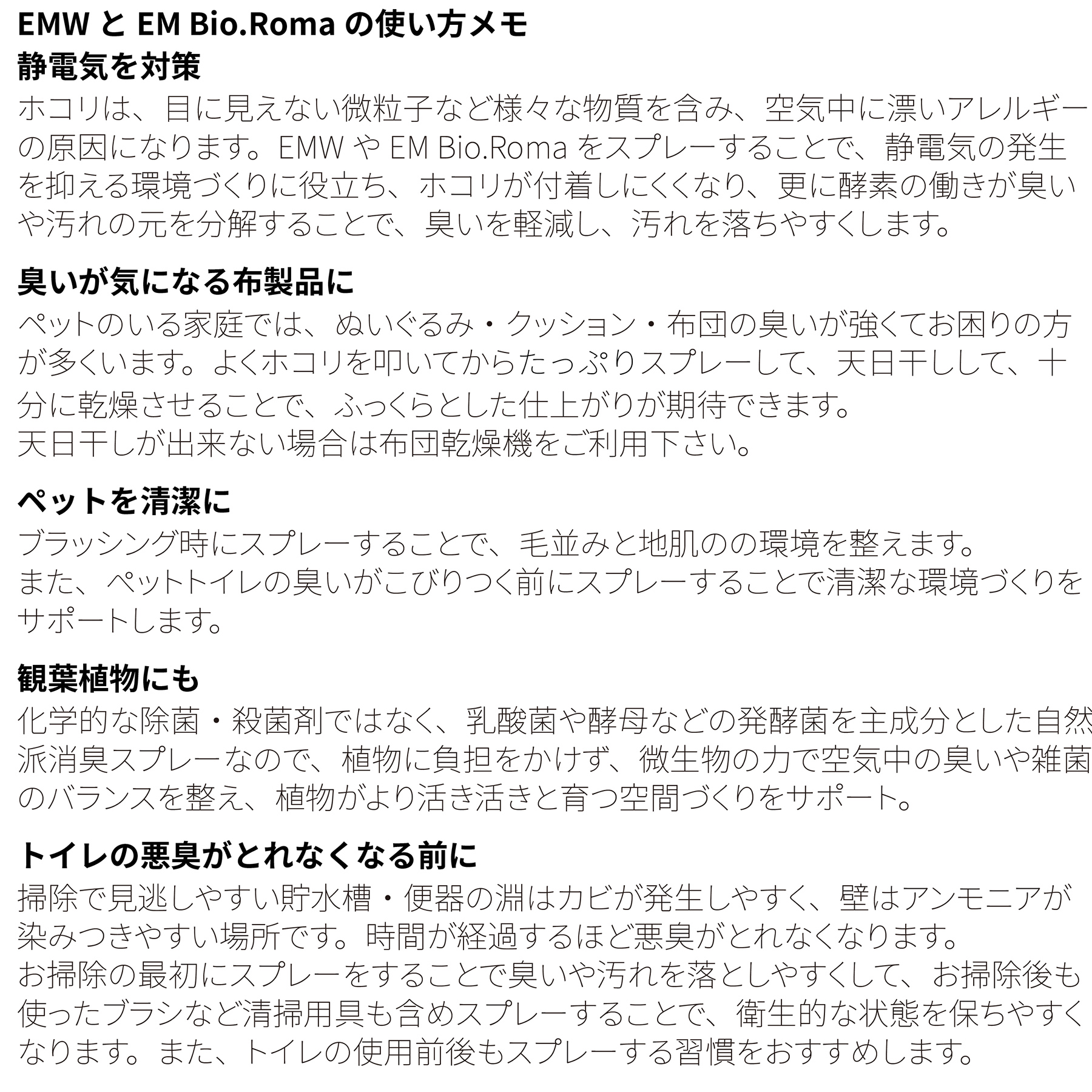 ■EM Bio.Romaは、既にスプレイヤーに希釈されているため即使えるうえ、詰め替え用もあるので非常に便利です。