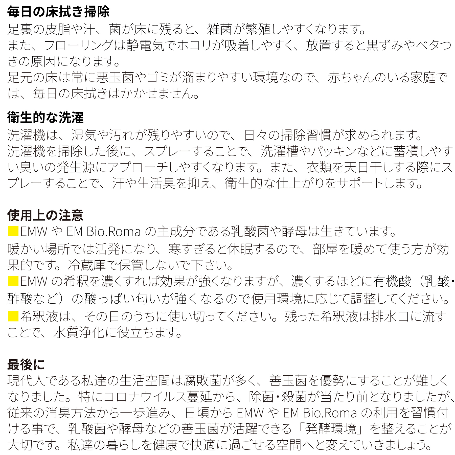 特にコロナウィルス蔓延から、除菌・殺菌が当たり前となりましたが、従来の消臭方法から一歩進み、日頃からEMWやEM Bio Romaの利用を習慣付ける事で、乳酸菌や酵母などの善玉菌が活躍できる「発酵環境」を整えることが大切です。私達の暮らしを健康で快適に過ごせる空間へと変えていきましょう。
