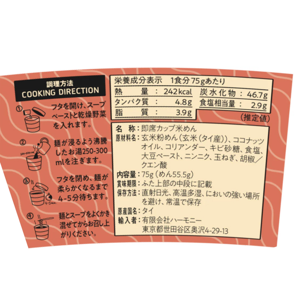 ◎原材料:玄米粉めん(タイ産玄米)、ココナッツオイル、コリアンダー、キビ砂糖、食塩、大豆ペースト、ニンニク、玉ねぎ、胡椒/クエン酸
