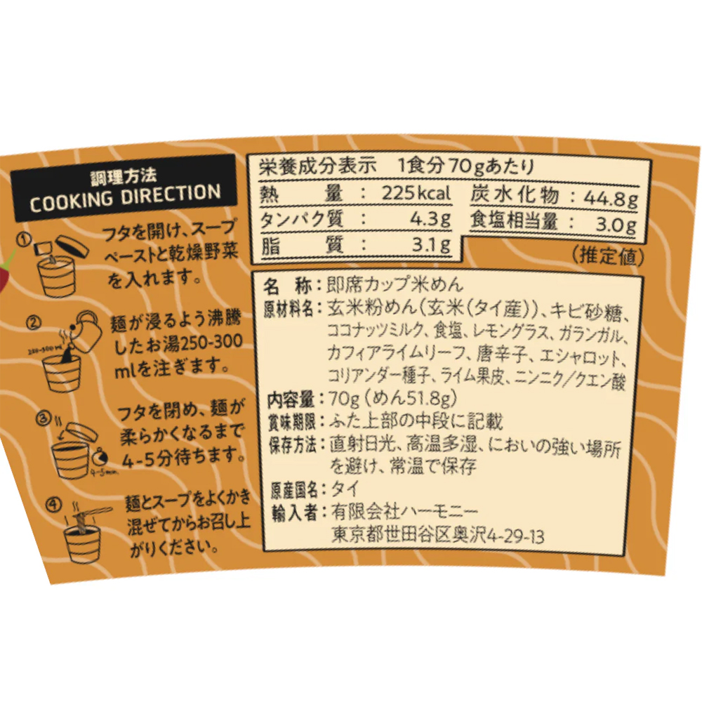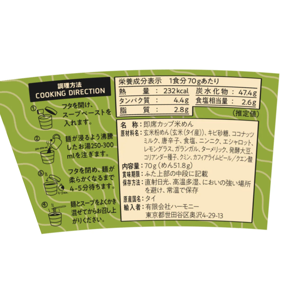◎原材料:玄米粉めん(タイ産玄米)、キビ砂糖、ココナッツミルク、食塩、レモングラス、ガランガル、カフィアライムリーフ、唐辛子、エシャロット、コリアンダー種子、ライム果皮、にんにく/クエン酸