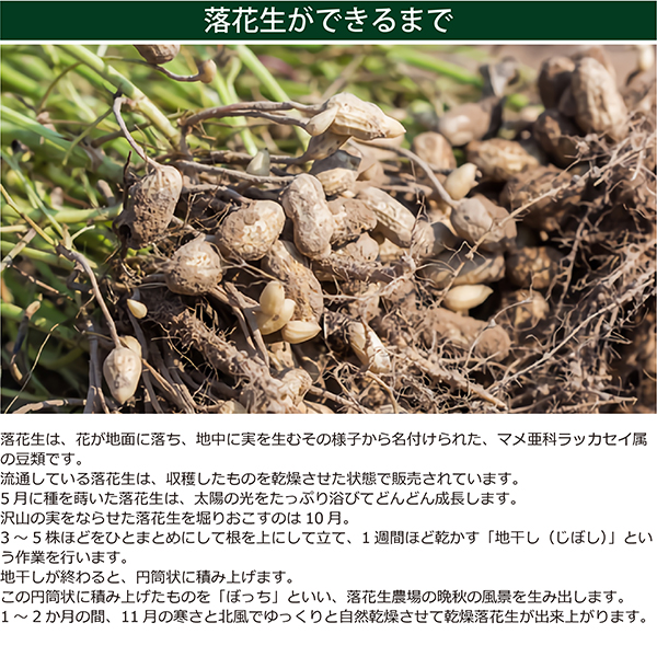 流通している落花生は、収穫したものを乾燥させた状態で販売されています。