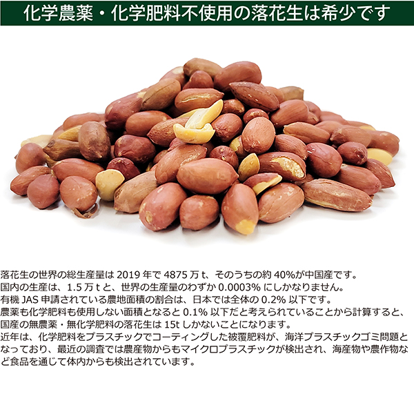 農薬も化学肥料も使用しない面積となると0.1%以下だと考えられていることから計算すると、国産の無農薬・無化学肥料の落花生は15tしかないことになります。