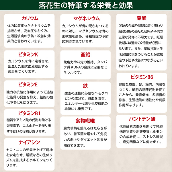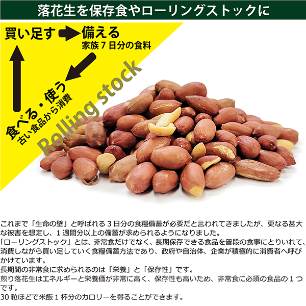 煎り落花生はエネルギーと栄養価が非常に高く、保存性も高いため、非常食に必須の食品の1つです。