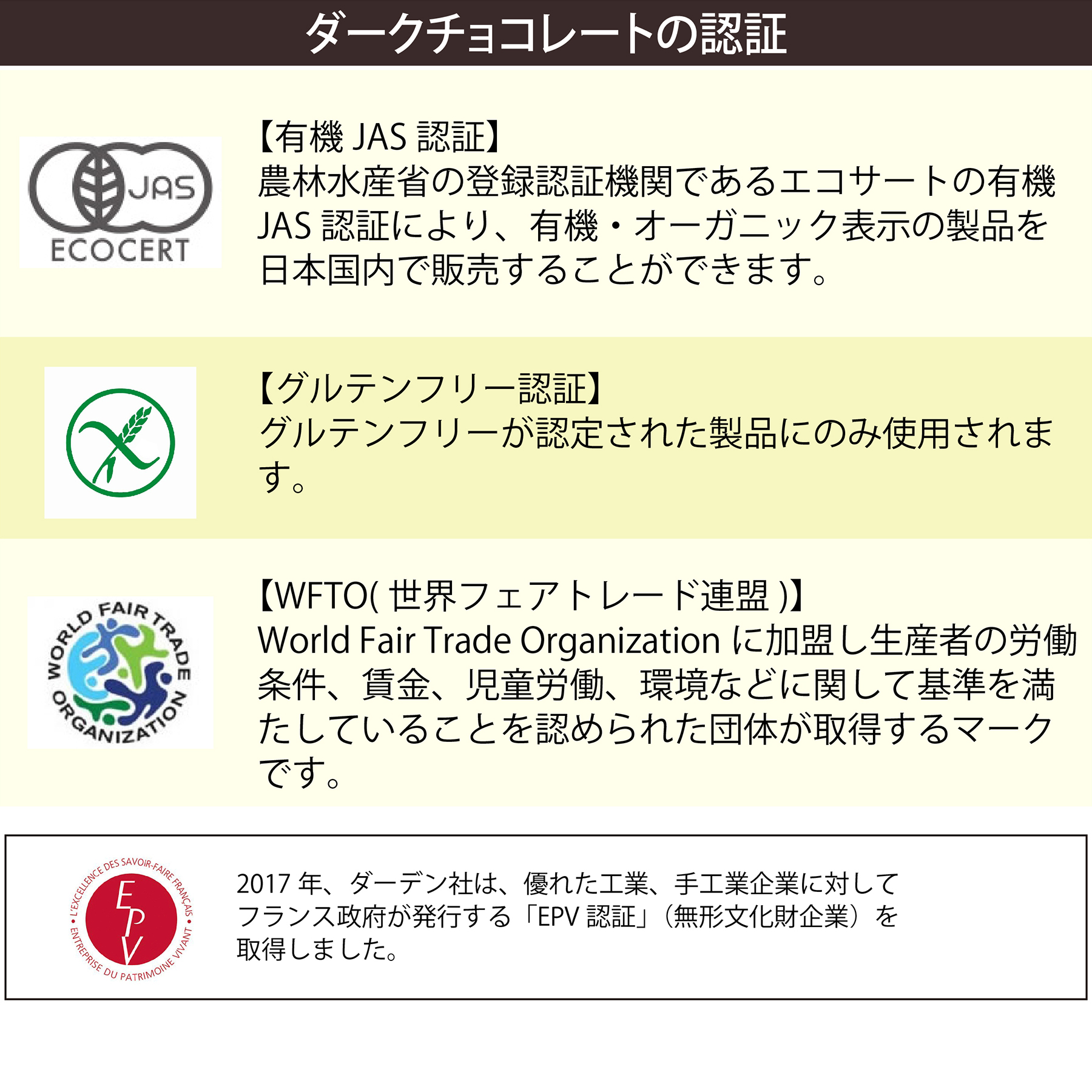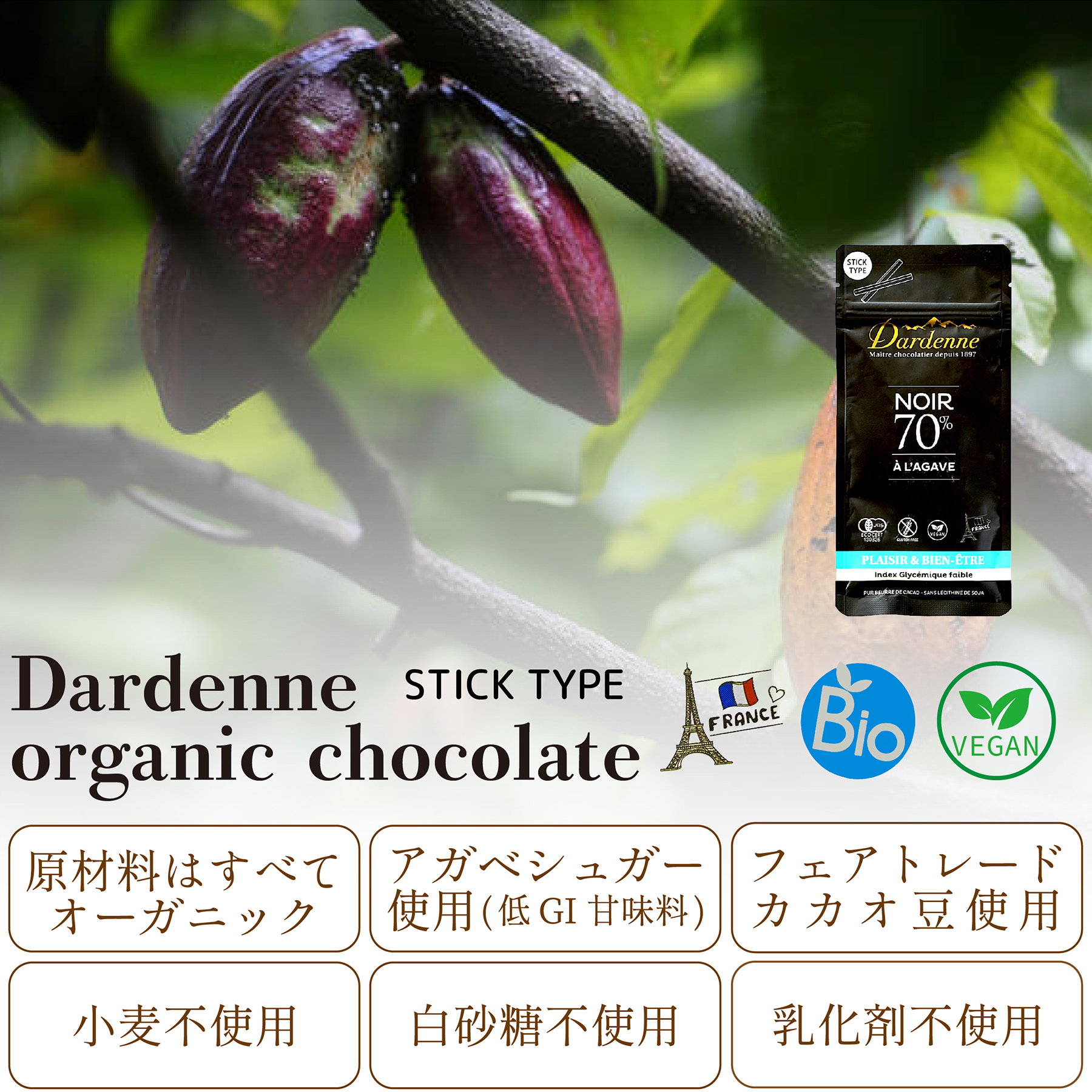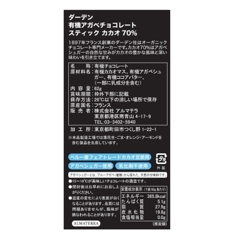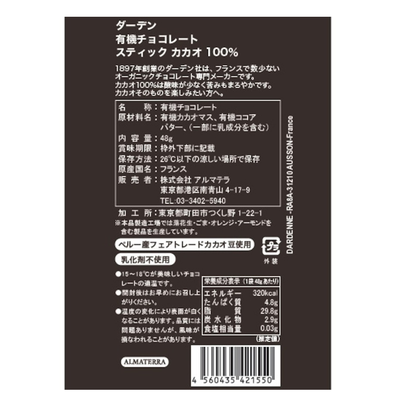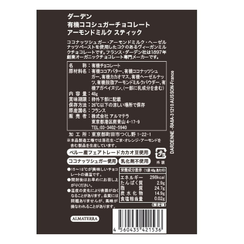 ダーデン 有機チョコレート スティック カカオ 100% [48g]、カカオ 70% [62g]、有機ココシュガーチョコレート アーモンドミルク スティック カカオ 58% [48g] 乳化剤不使用 有機JAS認証 ダークチョコ アルマテラ
