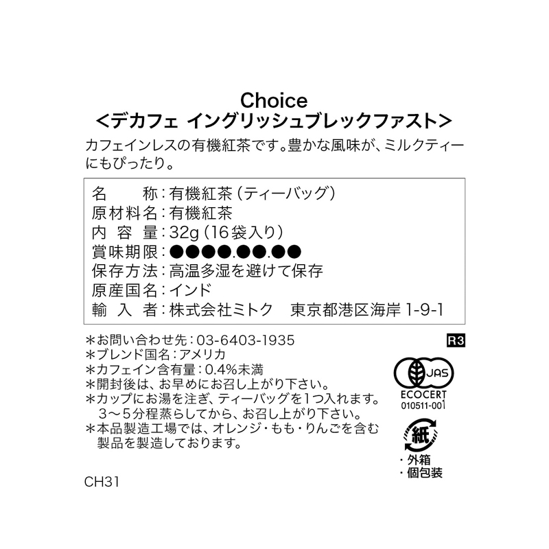 【OUTLET】有機デカフェ イングリッシュブレックファスト 32g(ティーバッグ16袋)[チョイス] ミトク