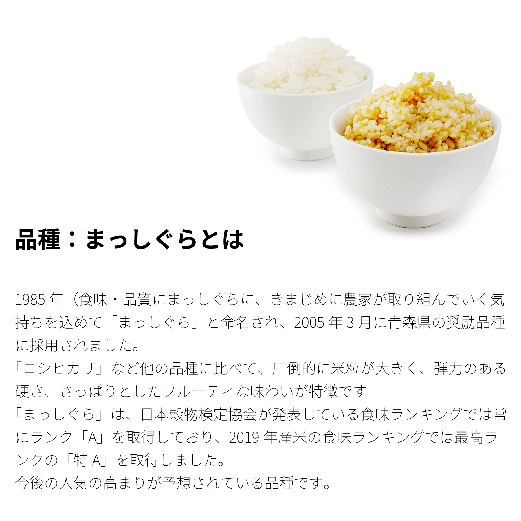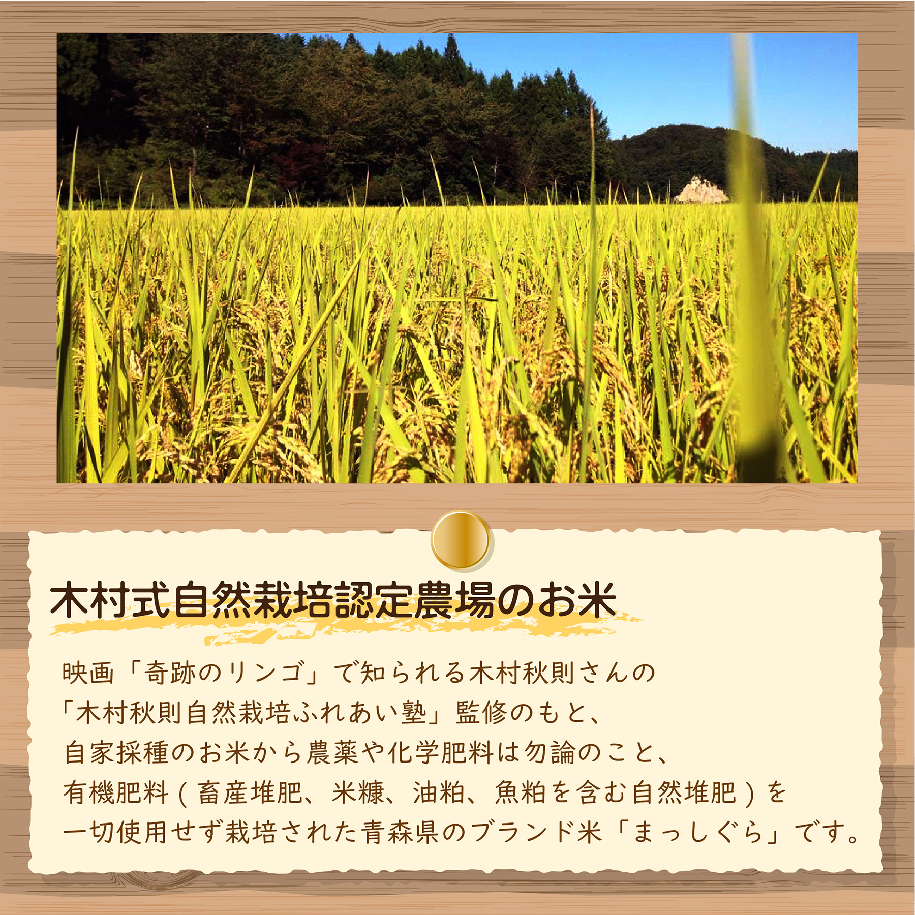 映画「奇跡のリンゴ」で知られる木村秋則さんの「木村秋則自然栽培ふれあい塾」監修のもと、自家採種のお米から農薬や化学肥料は勿論のこと、有機肥料(畜産堆肥、米糠、油粕、魚粕を含む自然堆肥)を一切使用せず栽培された青森県のブランド米「まっしぐら」です。