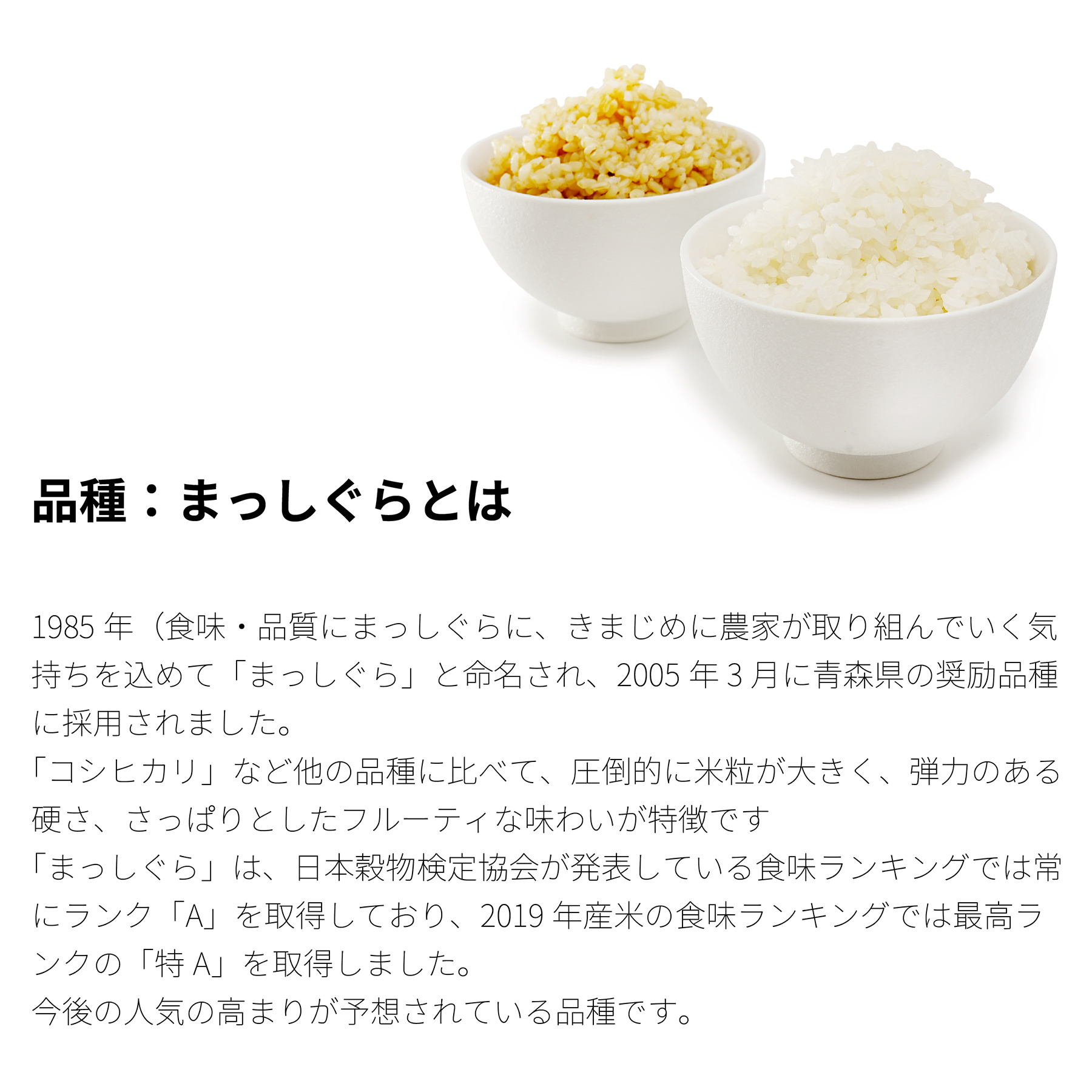 映画「奇跡のリンゴ」で知られる木村秋則さんの「木村秋則自然栽培ふれあい塾」監修のもと、自家採種のお米から農薬や化学肥料は勿論のこと、有機肥料(畜産堆肥、米糠、油粕、魚粕を含む自然堆肥)を一切使用せず栽培された青森県のブランド米「まっしぐら」です。