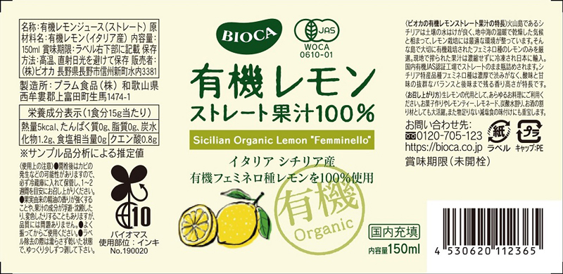 ビオカ(BIOCA)の「有機レモン果汁ストレート100%」は