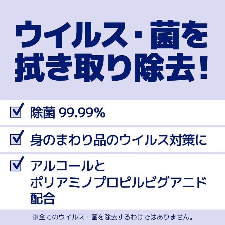 除菌99.99%。アルコールに加えてポリアミノプロピルビグアニドを配合。身のまわりの品、気になる箇所のウイルス対策に。