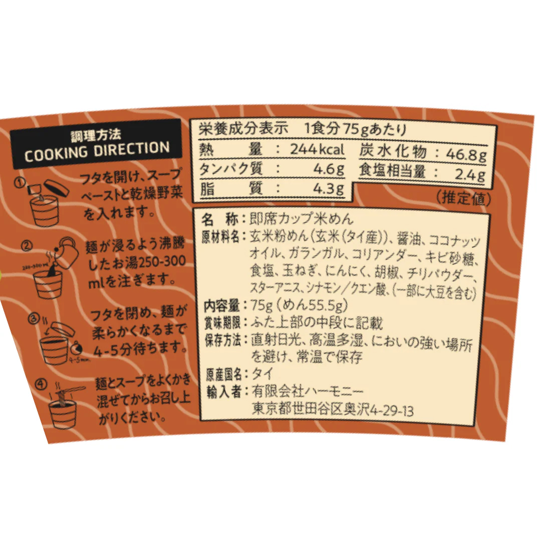 ◎原材料:玄米粉めん(タイ産玄米)、醤油、ココナッツオイル、ガランガル、コリアンダー、キビ砂糖、食塩、玉ねぎ、にんにく、胡椒、チリパウダー、スターアニス、シナモン/クエン酸(一部に大豆を含む)