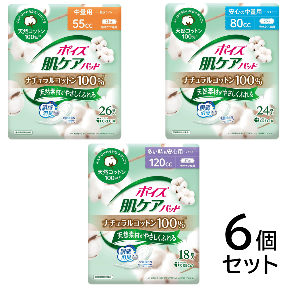 【6個セット 】ポイズ 肌ケアパッド ナチュラルコットン100% 尿漏れパット 吸水ナプキン 55cc 80cc 120cc 介護 ナプキン ポイズパッド 吸水ナプキン 尿モレ 日本製紙クレシア(Crecia)