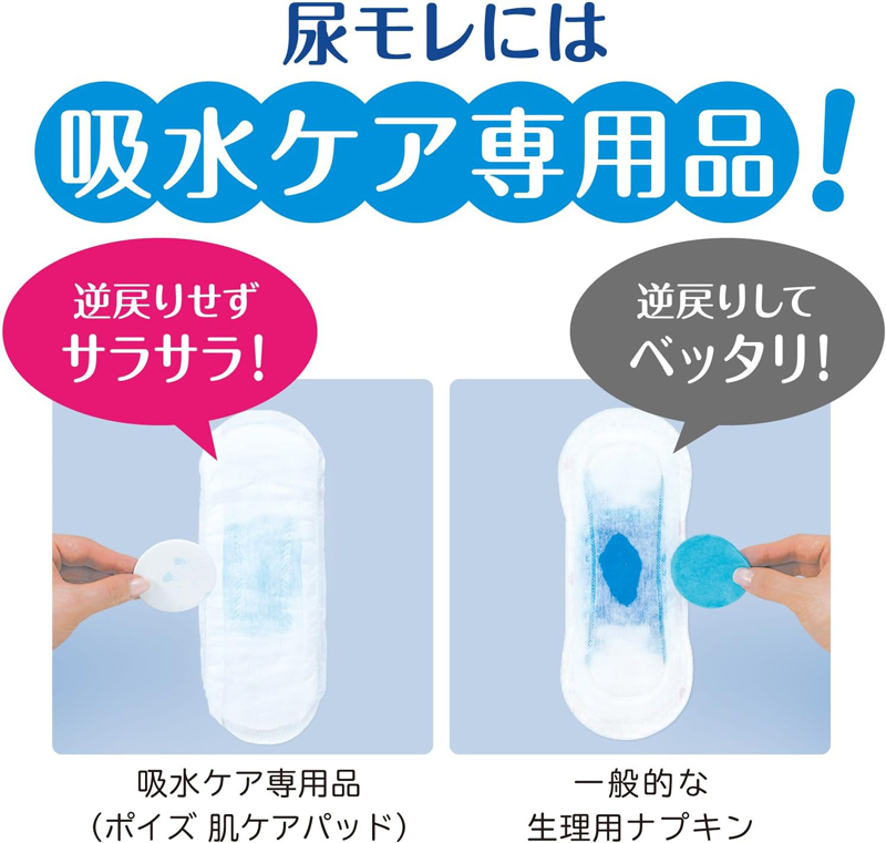 ・ポイズ 肌ケアパッドは、尿モレ(尿もれ)で悩んでいる方や、吸水ケアを生理用ナプキンで代用している方におすすめな尿ケア専用品(尿漏れパッド)。