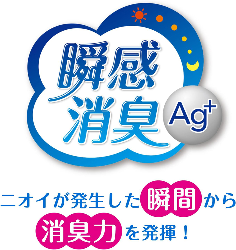 ・”弱酸性・全面通気性シート”に加え、”瞬間消臭シート”を採用しているので、ニオイが発生した瞬間から継続的に消臭力を発揮し、ニオイ菌の増殖を防ぎます。