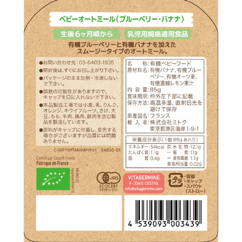 原材料 有機バナナ、有機ブルーベリー、有機オーツ麦、有機濃縮レモン果汁