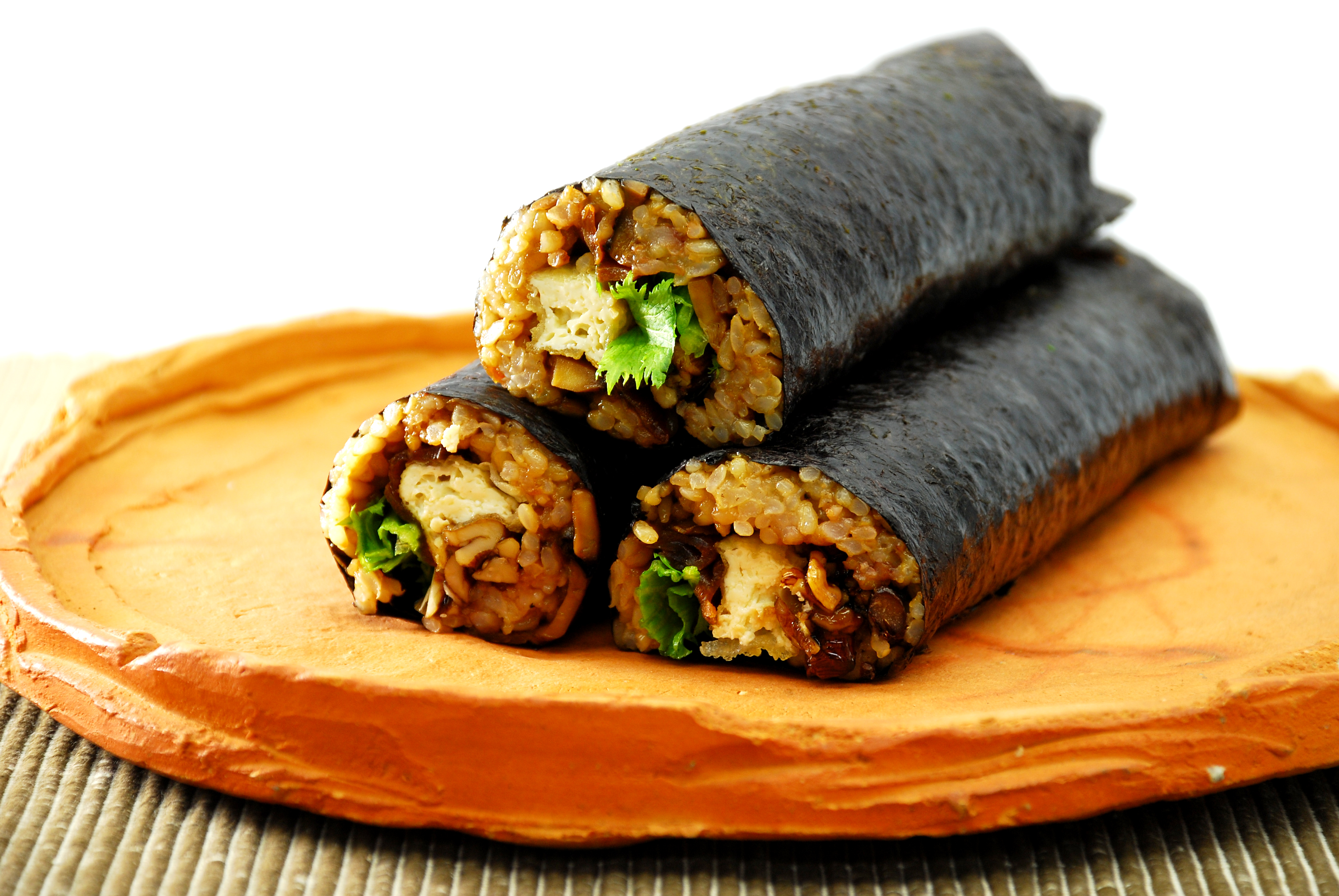 【作り方】 恵方巻 6本分 -五目御飯の具- <材料> ▪人参 80g ▪牛蒡 50g ▪椎茸 6傘 ▪出汁 200㏄ ▪醤油 80g ▪原料糖 20g ▪酒 15g ▪油 10g(菜の花へ) <作り方> ①鍋を火にかけ、油を入れ、人参、牛蒡、椎茸の順で炒めます。 ②酒を入れ軽く炒めたら、出汁、醤油、原料糖を入れ、内蓋をし、汁気が少なくなるまで煮詰めます。 -胡桃の甘辛煮- <材料> ▪胡桃 100g ▪みりん 30g ▪醤油 20g ▪原料糖 15g <作り方> ①くるみをオーブン120℃で10分程乾煎りします。(フライパンでも可) ②鍋にみりん、醤油、原料糖を入れ、一煮立ちしたらくるみを絡め水分を飛ばします。 -干瓢煮- <材料> ▪出汁 100㏄ ▪醤油 25g ▪みりん 25g ▪干瓢 20g ▪原料糖 2g <作り方> ①干瓢を水に漬け、戻します。 ②鍋に出汁、醤油、みりん、原料糖、干瓢を入れ、汁気がなくなるまで煮ます。 -揚げ豆富- <材料> ▪豆富 1丁 ▪玄米粉 ▪油 <作り方> ①豆富の水切りをします。 ②豆富を棒状に12等分します。 ③豆富に玄米粉をまぶし、160℃で約5分カリッとなるまで揚げます。 -巻き方- <材料> ▪酵素玄米御飯 900g ▪海苔 6枚 ▪五目御飯の具 ▪胡桃の甘辛煮 ▪干瓢煮 ▪揚げ豆富 ▪山葵菜やベビーリーフ、大葉などの季節の葉物 <作り方> ①酵素玄米御飯に五目御飯の具を混ぜます。 ②巻き簾に海苔を置き、五目御飯を180g広げます。 ③広げた御飯のやや下寄りに、揚げ豆富2本、葉物、干瓢、胡桃に甘辛煮の順で隙間なくのせます。 ④手前にある海苔を巻き簾ごと持ち上げ、具材を軽く押さえながら巻きます。 ⑤全体を巻き簾で包み、丸い形になるよう整え、そっとはずせば完成。
