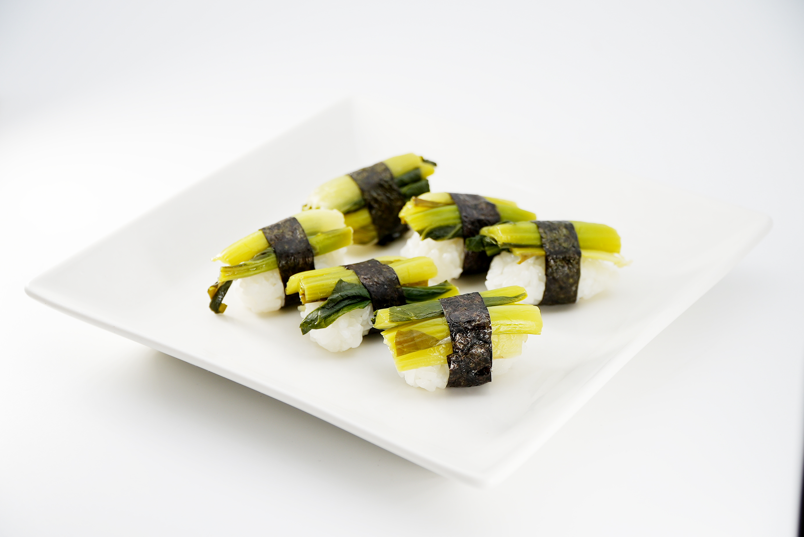 VEGAN寿司 小松菜漬け寿司 2026/02/25 <材料> ▪小松菜 130g ▪塩 ひとつまみ(0.5g) ▪酢 8g お好みで唐辛子の千切りを飾ります。 ▪御飯 一貫あたり10g ▪海苔 適量 【作り方】 ①小松菜を洗い4センチほどに切ります。 ②沸騰したお湯で茎は約30秒、葉は15秒茹でます。 ③しっかりとお湯を切り、温かいうちに酢と塩を入れ揉みます。 ③米を握り、小松菜を乗せ、細く切った海苔を巻いたら完成。
