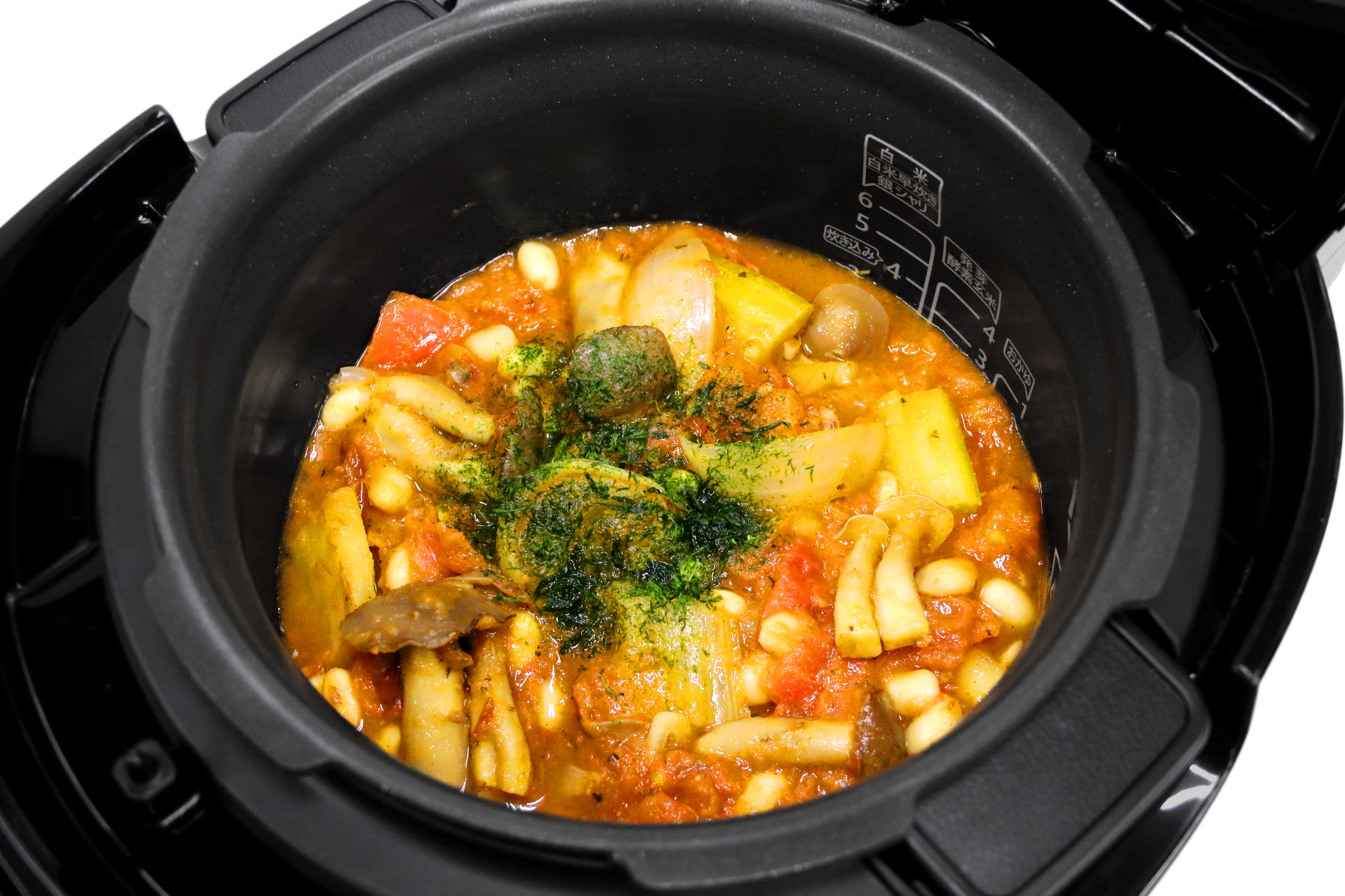 【4人分の材料】 ▪トマト 600g ▪人参 150g ▪シメジ 150g ▪玉葱 100g ▪ブラウンマッシュルーム 60g ▪大豆 20g ▪大蒜 適量 ▪塩 小匙1/2 ▪スパイス(ローレル、コリアンダー) 適量 【作り方】 ①野菜をお好みの大きさに切ります。 ②内釜に①の野菜、1晩水に浸水した大豆、塩、スパイスを入れます。 ③圧力ロックハンドルを「圧力」に合わせ、「メニュー」ボタンを押し、「圧力調理」を選択した後、「設定/決定」ボタンを押します。 次に、「メニュー」ボタンの左右キーで調理時間を20分に設定し、「設定/決定」ボタンを押します。 同様に、「メニュー」ボタンの左右キーで調理温度を110度に設定し、「設定/決定」ボタンを押します。 最後に、「圧力炊飯/スタート」ボタンを押し、調理が完了するのを待ちます。