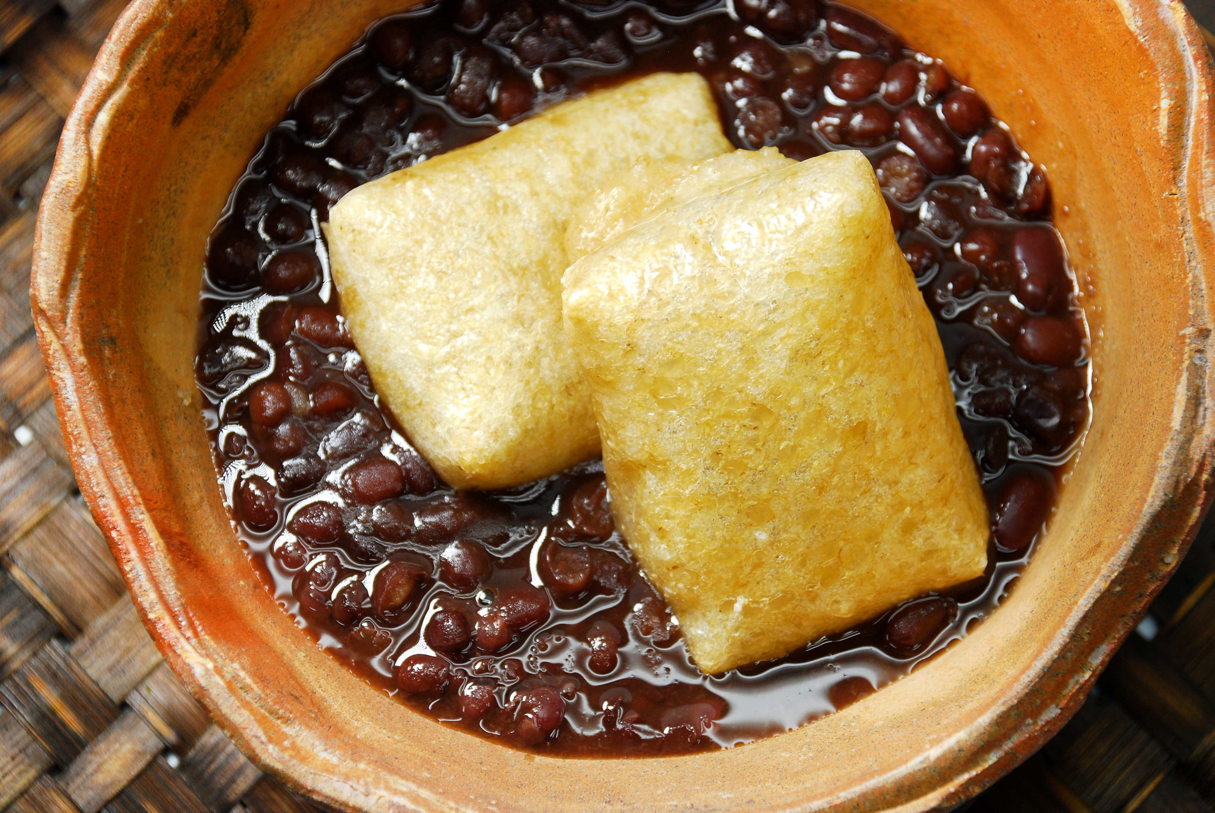 栄養価が高い玄米餅を原料糖と小豆で作った餡子のお汁粉にして、血糖値の上がりにくいヘルシー