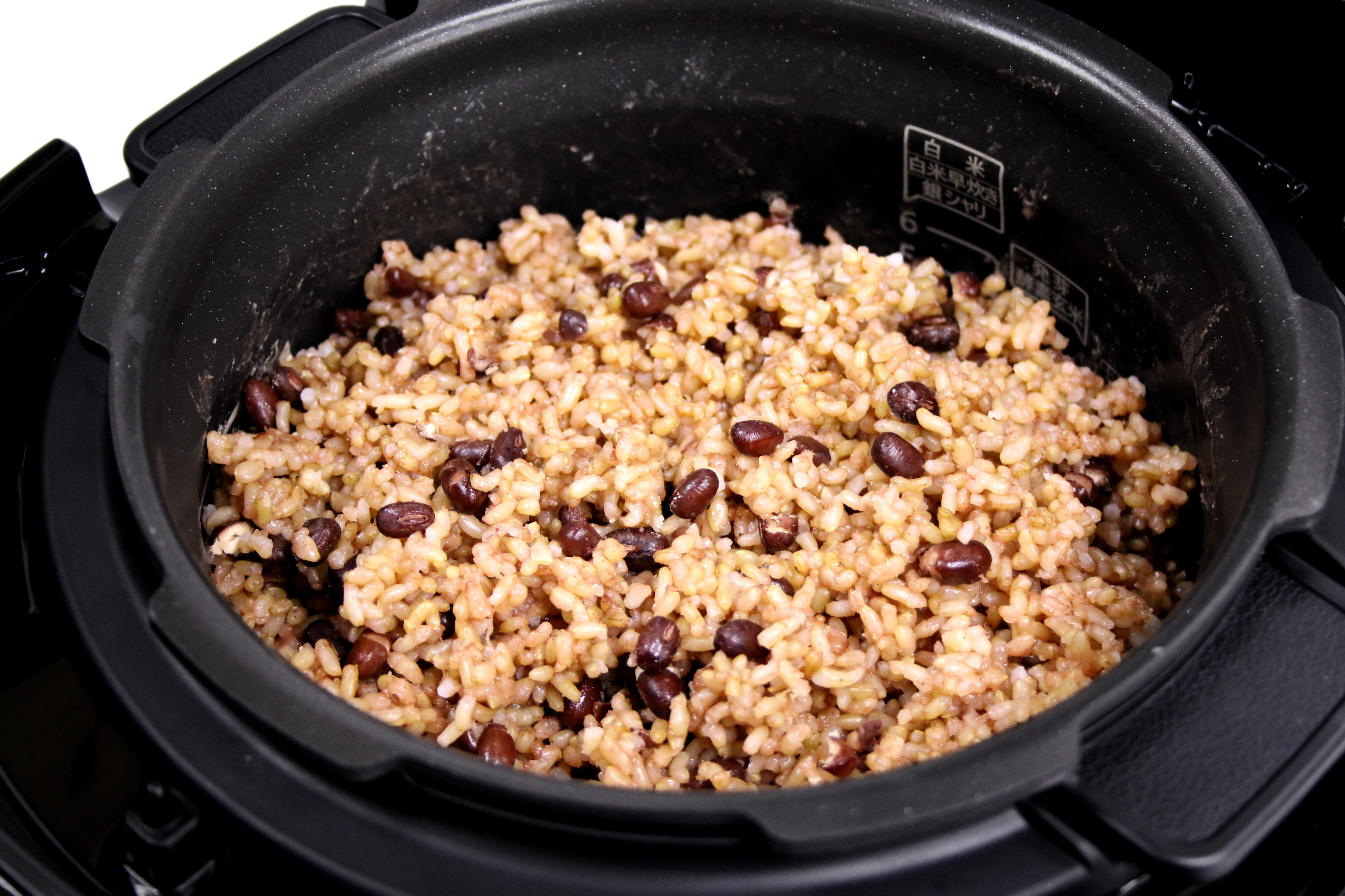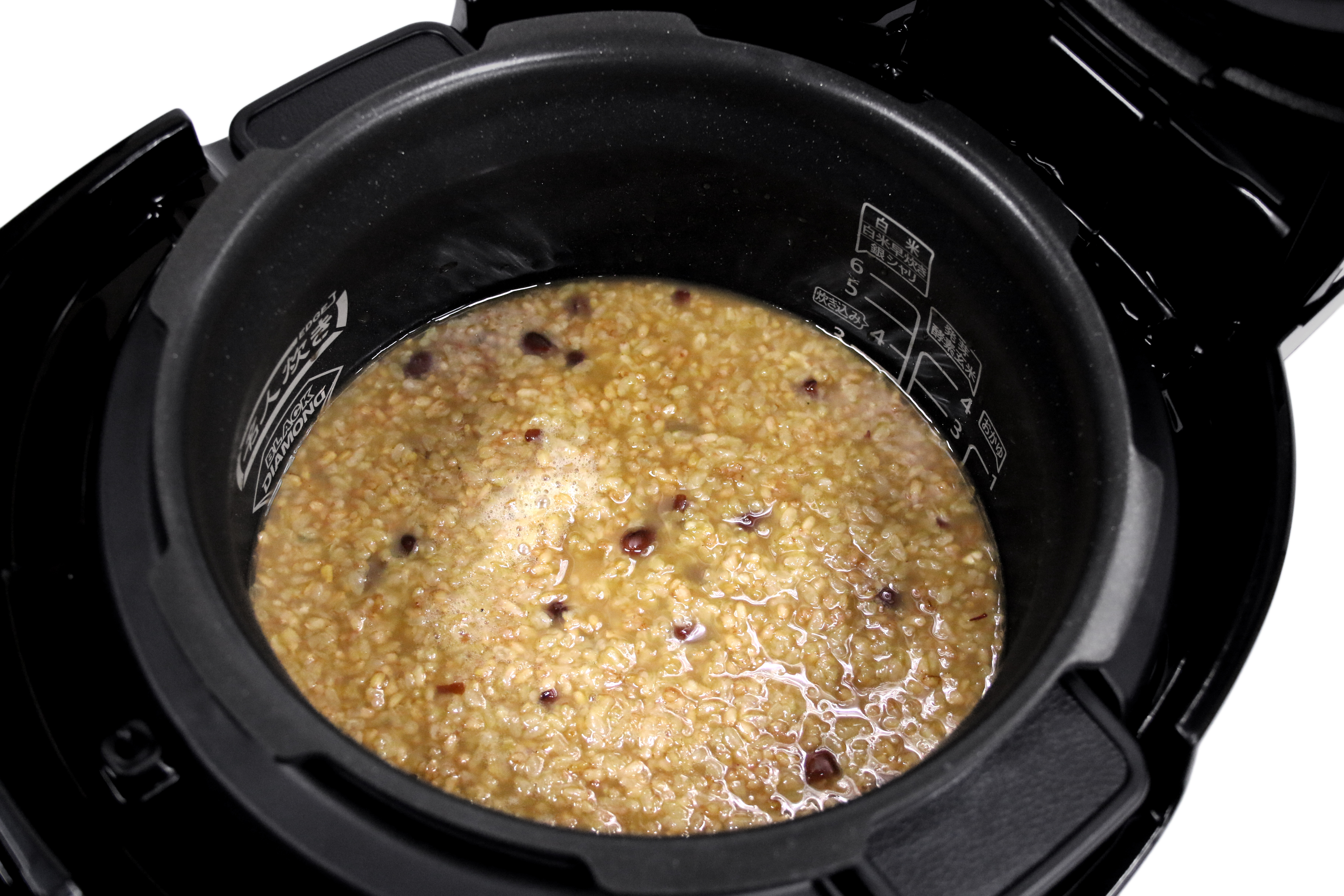 【材料 4合分】 ▪玄米 600g ▪小豆 60g ▪塩 6g ▪EMX GOLD 30ml 【作り方】 ①玄米と小豆を水で拝み洗いをして汚れを落とします。 ②水を切り、①をボウルに入れ、材料が浸る程度まで水、塩、EMX-GOLDを加え、手または泡立て器で右回りに8分混ぜます。 ③内釜に②を入れ、内釜の表示目盛り「発芽酵素玄米4合」ラインまで水を入れます。 ④圧力ロックハンドルを「圧力」に合わせ、「メニュー」ボタンを押し、「発芽酵素玄米」を選択した後、「設定/決定」ボタンを押します。 次に、「メニュー」ボタンの左右キーで発芽時間4時間または6時間を選択します。 最後に、「圧力炊飯/スタート」ボタンを押し、調理が完了するのを待ちます。