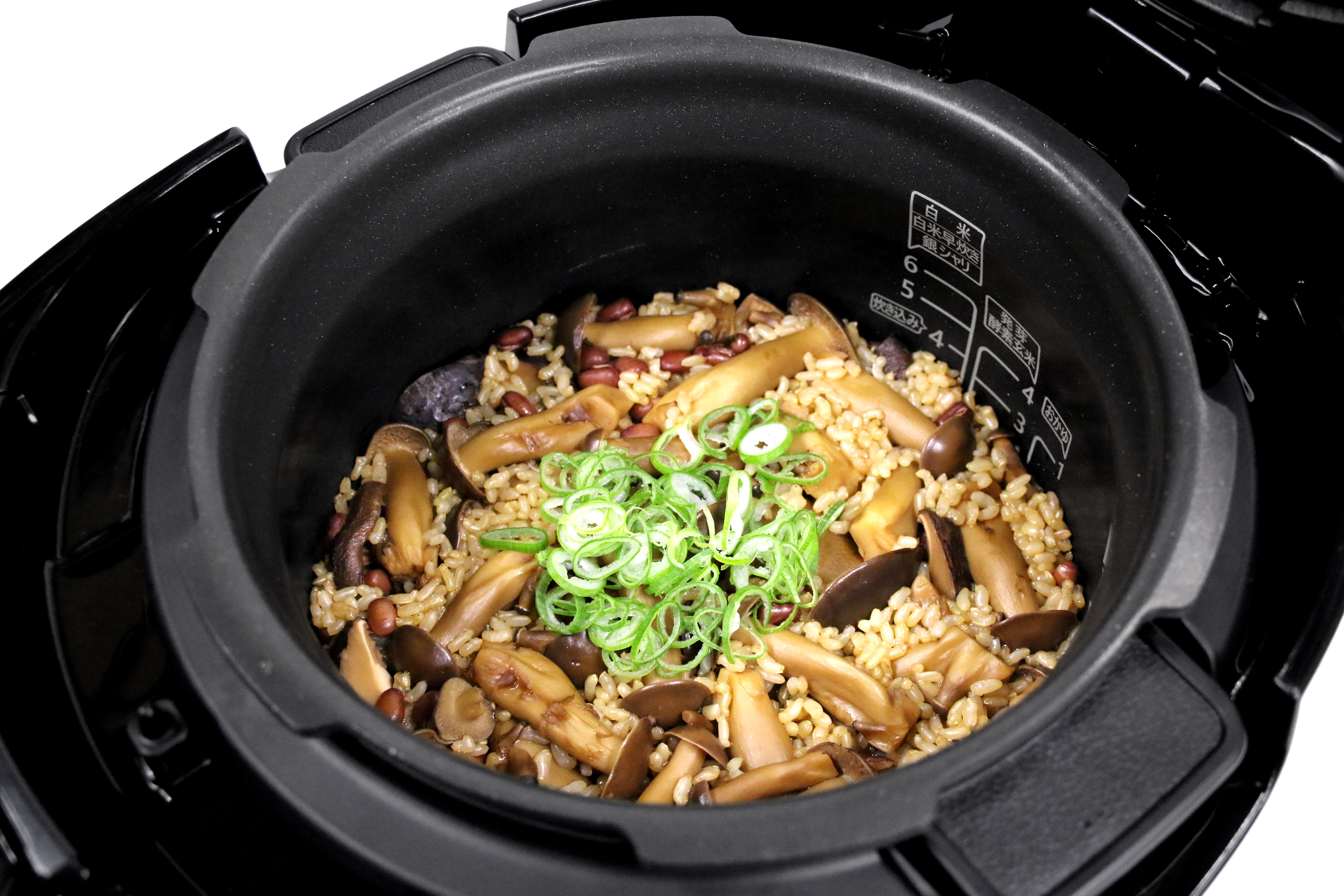 【材料 3合分】 ▪玄米 450g ▪小豆 45g ▪EMX GOLD 20ml ▪シメジ 300g ▪原木生椎茸 150g ▪醤油 38g ▪原料糖 6g ▪塩 4g 【作り方】 ①玄米と小豆を水で拝み洗いをして汚れを落とします。 ②水を切り、①をボウルに入れ、材料が浸る程度まで水を加えます。次に、塩とEMX-GOLDを加え、手または泡立て器で右回りに8分混ぜます。 ③内釜に②を入れ、内釜の表示目盛り「発芽酵素玄米3合」ラインまで水を入れます。 ④さらに醤油、原料糖、切った茸、お好みで唐辛子を入れます。 ⑤圧力ロックハンドルを「圧力」に合わせ、「メニュー」ボタンを押し、「発芽酵素玄米」を選択した後、「設定/決定」ボタンを押します。 次に、「メニュー」ボタンの左右キーで発芽時間6時間を選択します。 最後に、「圧力炊飯/スタート」ボタンを押し、調理が完了するのを待ちます。