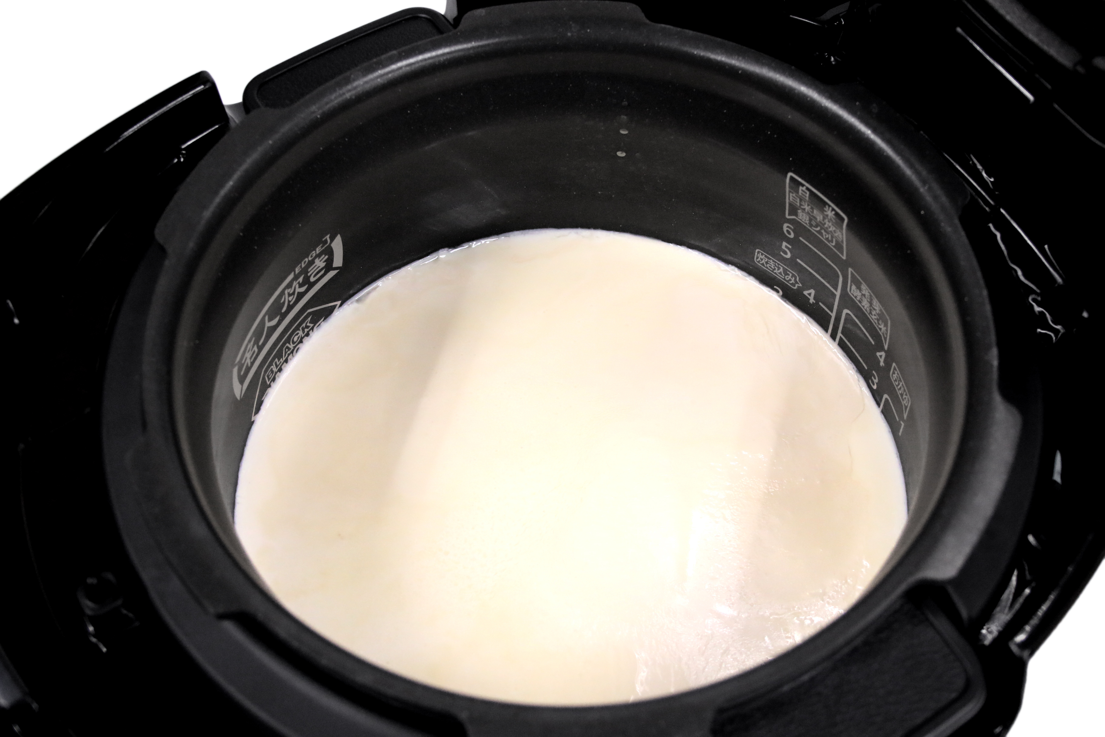 【材料】 ▪生豆乳 450g ▪乳酸菌 50cc ▪原料糖シロップ 5g 【乳酸菌の材料】 ▪玄米のとぎ汁 150g ▪原料糖(玄米のとぎ汁の3%) 4.5g ▪塩(玄米のとぎ汁の1%) 1.5g 【作り方】 ①乳酸菌を作ります。 熱消毒し乾かした瓶に、とぎ汁と原料糖、塩を入れ蓋をし、1日1回栓をしたまま混ぜ、軽く栓を開けて、“プシュッ”と音をさせながら、2~3日間程で匂いや味がまろやかになったら、乳酸菌の完成。完成したら冷蔵庫で保管してください。 ②内釜に豆乳を入れ、乳酸菌、原料糖シロップ(原料糖と水を1:1の割合で煮詰めたもの)を入れ、軽く混ぜます。 ③圧力ロックハンドルを「無圧」に合わせ、「メニュー」ボタンを押し、「あま酒」を選択した後、「設定/決定」ボタンを押します。 次に「無圧炊飯/スタート」ボタンを押し、調理が完了するのを待ちます。