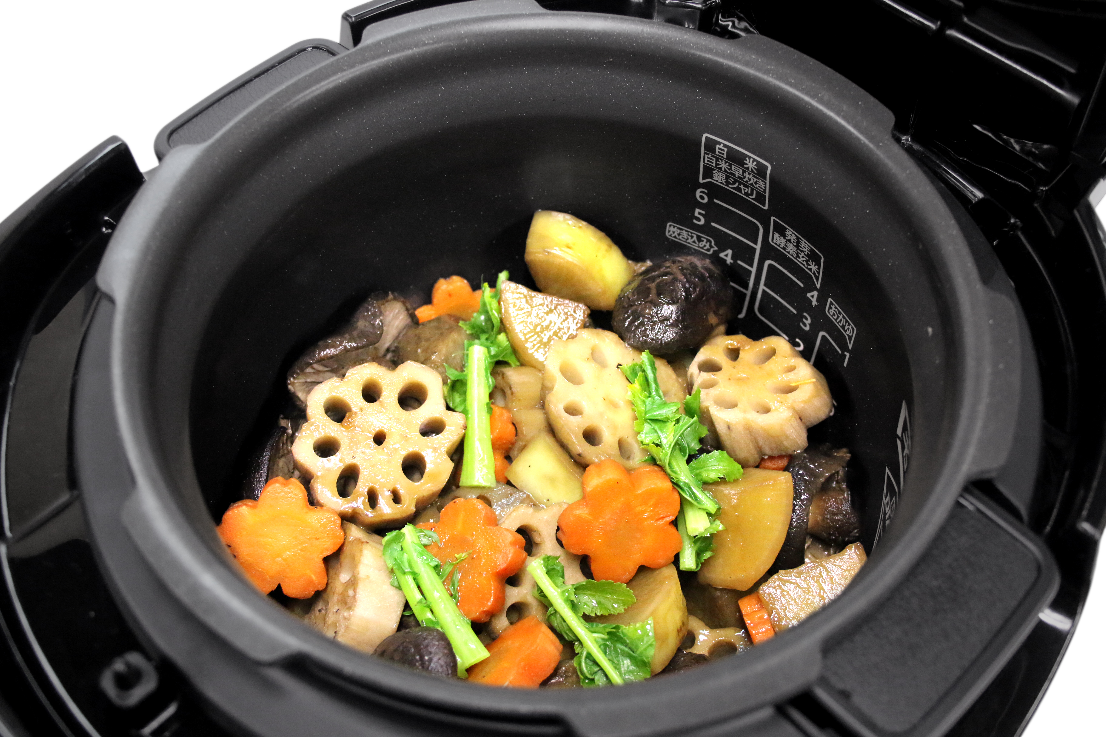 【4人分の材料】 ▪大根 200g ▪蓮根 150g ▪人参 100g ▪原木生椎茸 100g ▪牛蒡 1/2本 ▪出汁 150cc ▪醤油 20cc ▪味醂 20cc ▪原料糖 5g 【作り方】 ①野菜をお好みの大きさに切ります。 ②内釜に①の野菜、1晩水に浸水した大豆、塩、スパイスを入れます。 ③圧力ロックハンドルを「圧力」に合わせ、「メニュー」ボタンを押し、「圧力調理」を選択した後、「設定/決定」ボタンを押します。 次に、「メニュー」ボタンの左右キーで調理時間を20分に設定し、「設定/決定」ボタンを押します。 同様に、「メニュー」ボタンの左右キーで調理温度を110度に設定し、「設定/決定」ボタンを押します。 最後に、「圧力炊飯/スタート」ボタンを押し、調理が完了するのを待ちます。