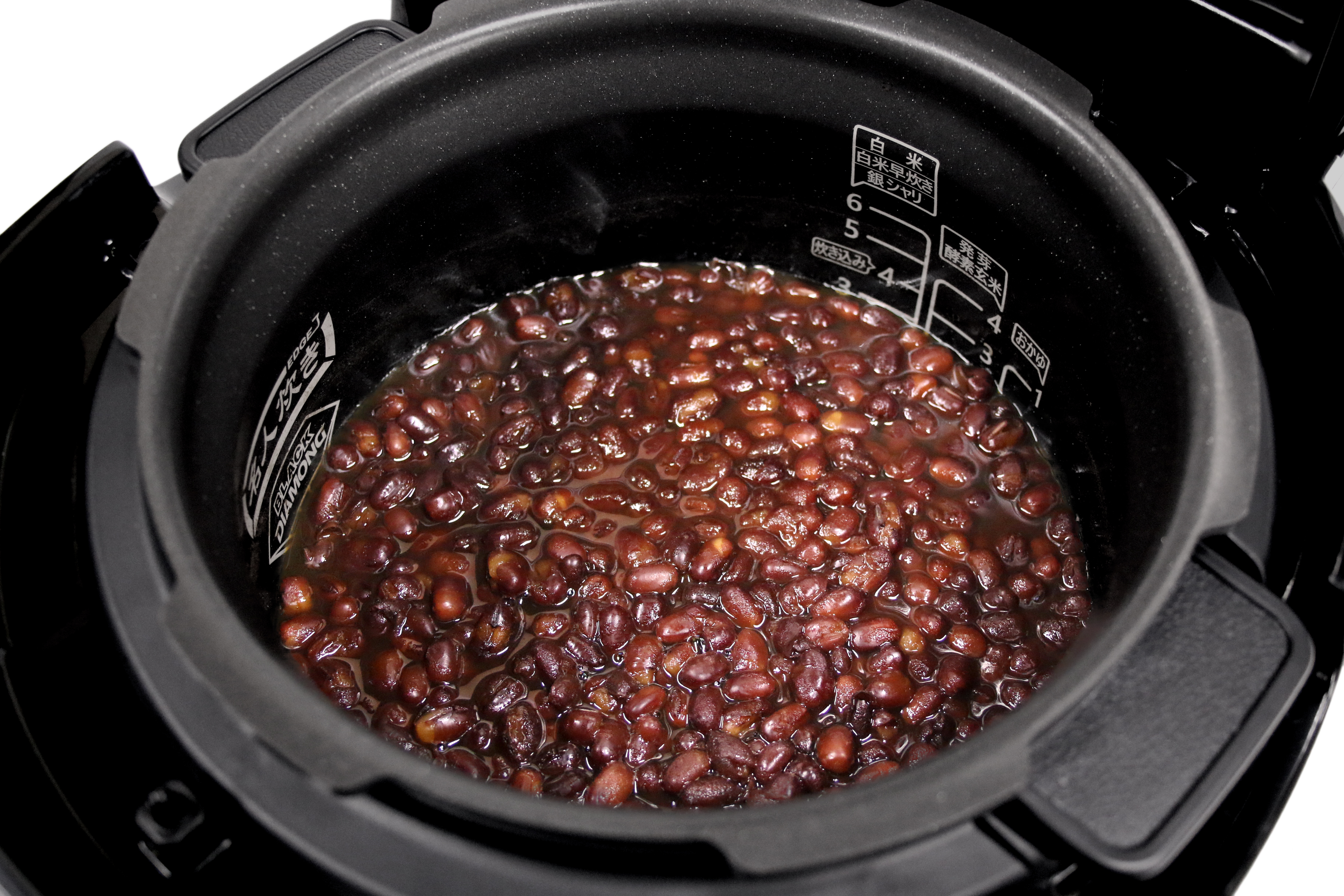 【材料】 ▪小豆 250g ▪原料糖 200g ▪EM WATER(ミネラルウォーター) 500~700g 【作り方】 ①内釜に洗った小豆、水を入れます。 ②圧力ロックハンドルを「圧力」に合わせ、「メニュー」ボタンを押し、「圧力調理」を選択した後、「設定/決定」ボタンを押します。 次に、「メニュー」ボタンの左右キーで調理時間を60分に設定し、「設定/決定」ボタンを押します。 同様に、「メニュー」ボタンの左右キーで調理温度を110度に設定し、「設定/決定」ボタンを押します。 最後に、「圧力炊飯/スタート」ボタンを押し、調理が完了するのを待ちます。 󣚄後、原料糖を2~3回に分けて入れて混ぜ、10分程保温にし、出来上がりを待ちます。 緩すぎる場合は、「保温/再加熱」ボタンを2度押し、再加熱をしてください。