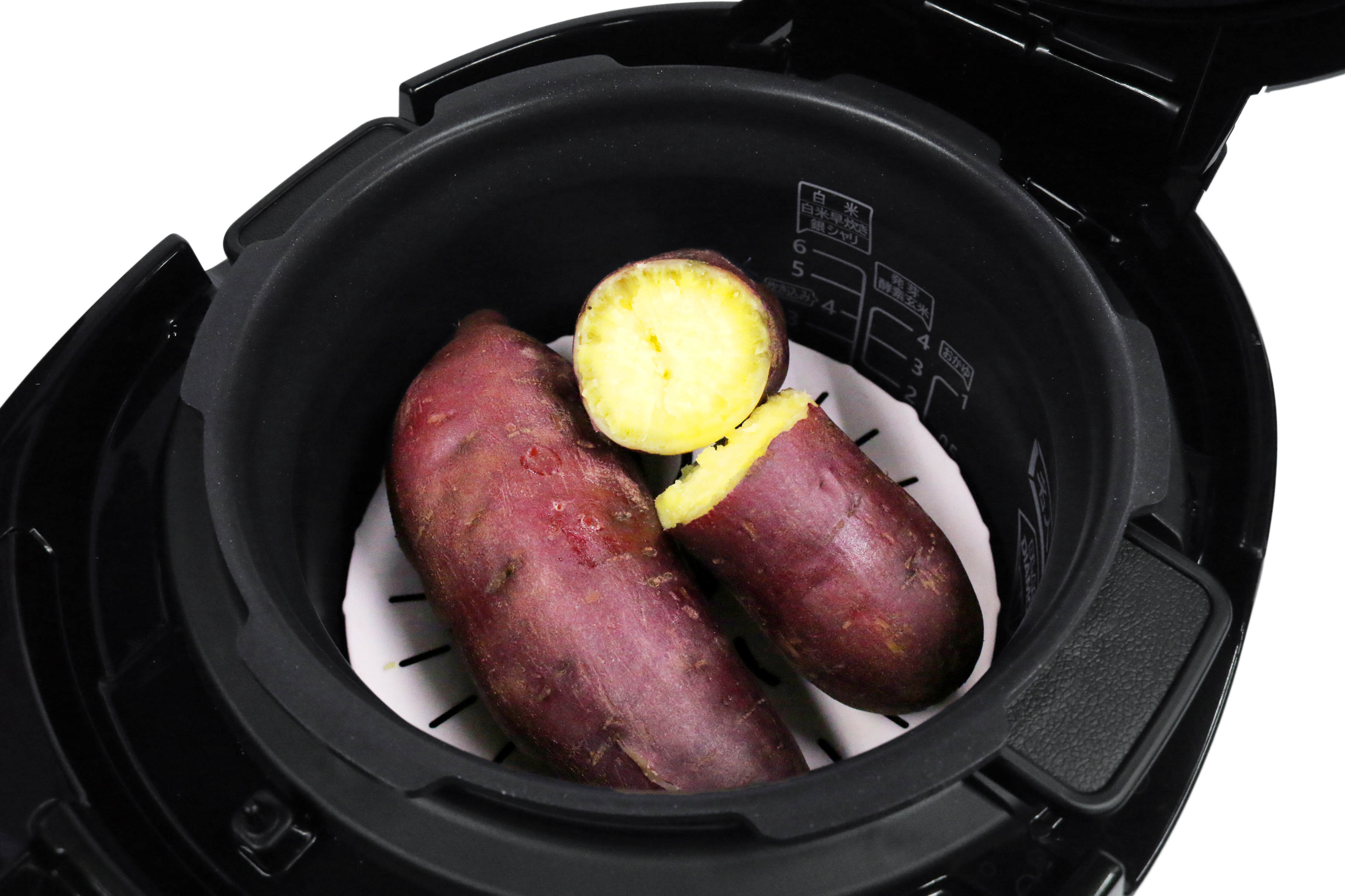 【材料】 ▪さつまいも 2本 ▪EM WATER 100~200cc 【作り方】 ①内釜に水、蒸し器(又はざる)を入れ、さつまいもをお好みの大きさに切り、並べます。 ②圧力ロックハンドルを「圧力」に合わせ、「メニュー」ボタンを押し、「圧力調理」を選択した後、「設定/決定」ボタンを押します。 次に、「メニュー」ボタンの左右キーで調理時間を20分~30分に設定し、「設定/決定」ボタンを押します。 同様に、「メニュー」ボタンの左右キーで調理温度を110度に設定し、「設定/決定」ボタンを押します。 最後に、「圧力炊飯/スタート」ボタンを押し、調理が完了するのを待ちます。