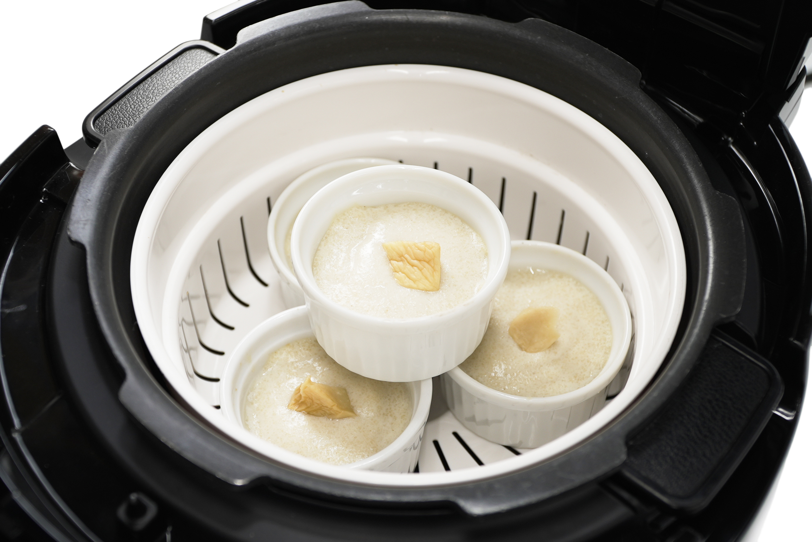 【5個分の材料】 ▪生豆乳 150g ▪玄米餅 1枚50g ▪乾燥エリンギ 15g ▪ビオソルト(BioSalt) 少々 ▪醤油 少々 ▪乾燥エリンギの戻し汁 50g 【作り方】 ①乾燥エリンギを4~5時間水で戻します。 ②真空ブレンダーに、トッピング用の乾燥エリンギを残し、それ以外の材料を全て撹拌し、5等分になるように器に流し混みます。トッピングの乾燥エリンギを上に乗せます。 ③内釜に水、蒸し器を入れ、器をセットします。 ④圧力ロックハンドルを「圧力」に合わせ、「メニュー」ボタンを押し、「圧力調理」を選択した後、「設定/決定」ボタンを押します。 次に、「メニュー」ボタンの左右キーで調理時間を10分に設定し、「設定/決定」ボタンを押します。 同様に、「メニュー」ボタンの左右キーで調理温度を100度に設定し、「設定/決定」ボタンを押します。 最後に、「圧力炊飯/スタート」ボタンを押し、調理が完了するのを待ちます。
