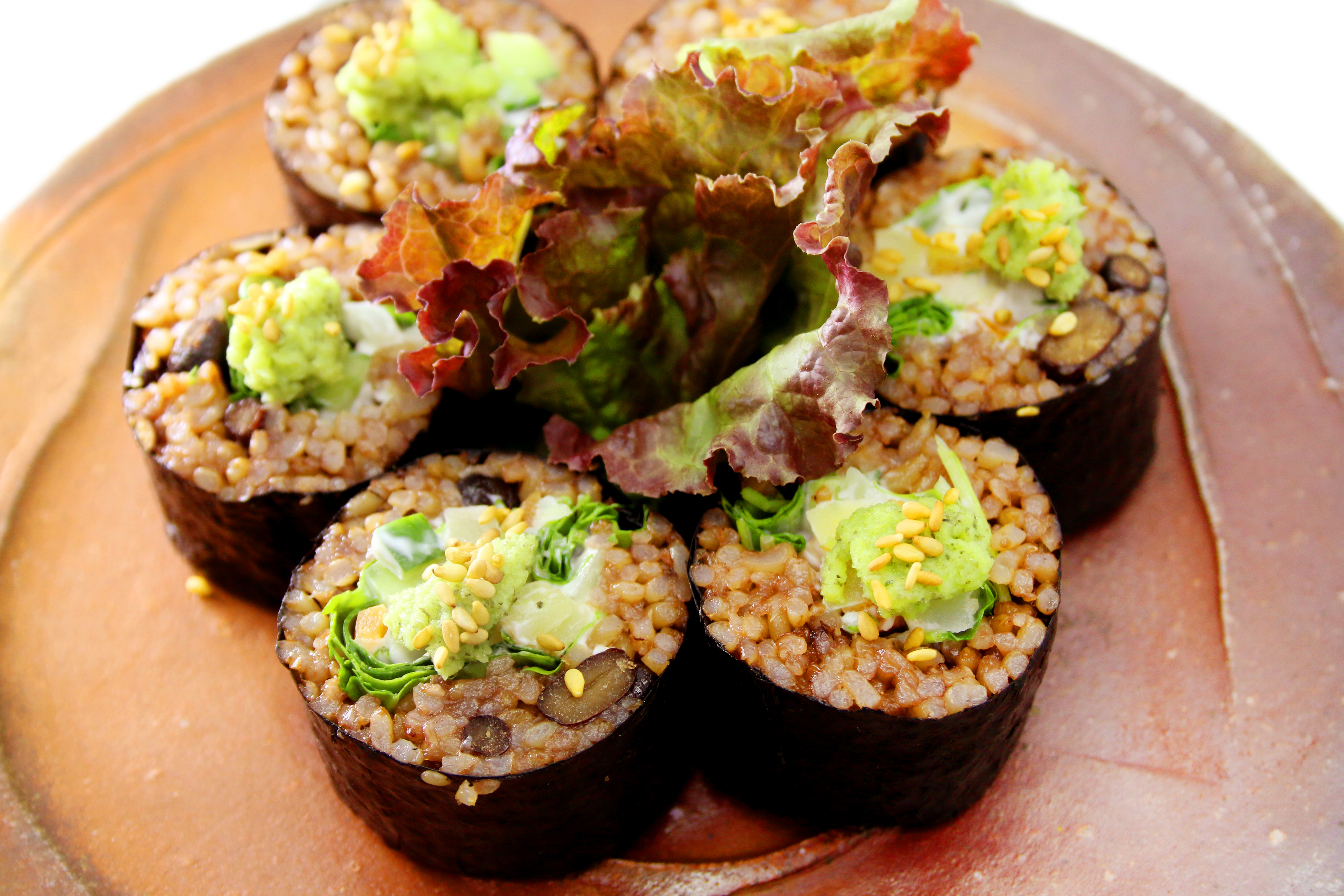 <材料> ▪人参 120g ▪ジャガイモ 90g ▪玉葱 90g ▪マヨネーズ 140g ▪ビオソルト ふたつまみ ▪ブラックペッパー 少々 ▪山葵菜やベビーリーフ、大葉などの季節の葉物 ▪干し海苔 ▪酵素玄米ご飯 200g ▪粉わさび 適量 ▪金胡麻 適量 【作り方】 ①人参、ジャガイモ、玉葱はみじん切りにします。 ②人参とジャガイモはそれぞれ柔らかくなるまで煮た後、しっかりと水切りをします。 ③ボウルに野菜を入れ、マヨネーズ、ビオソルト、ブラックペッパーを入れ混ぜ合わせます。 ④巻き簾に海苔を置き、酵素玄米御飯を200g広げます。 ⑤広げた御飯のやや下寄りに、大葉、サラダ巻きの具を置きます。 ⑥手前にある海苔を巻き簾ごと持ち上げ、具材を軽く押さえながら巻きます。 ⑦全体を巻き簾で包み、丸い形になるよう整え、そっとはずします。 ⑧2センチ程に切り、練った山葵と金胡麻をかけ完成。